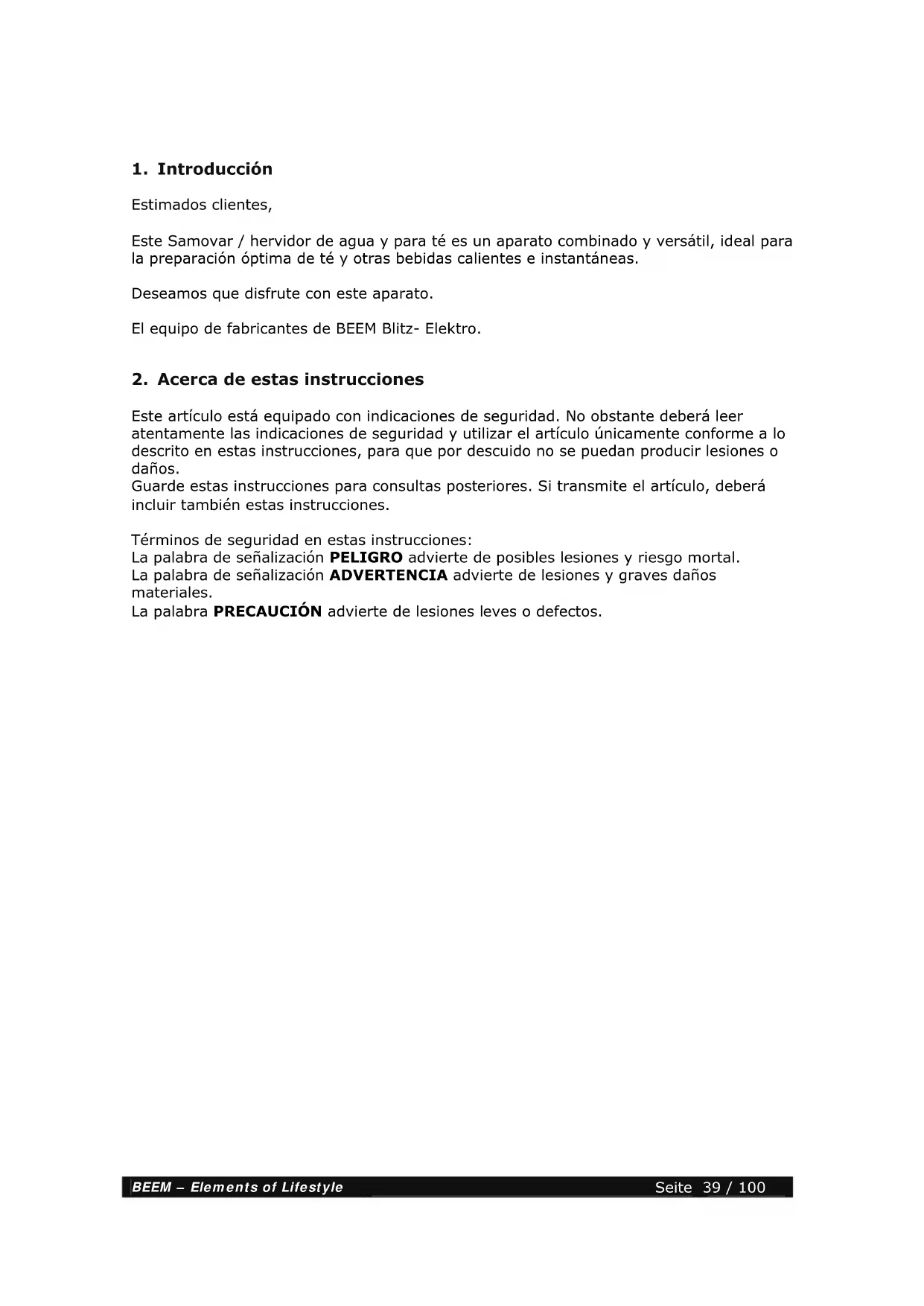 Este artículo está equipado con indicaciones de seguridad. No obstante deberá leer atentamente las indicaciones de seguridad y utilizar el artículo únicamente conforme a lo descrito en estas instrucciones, para que por descuido no se puedan producir lesiones o daños. Guarde estas instrucciones para consultas posteriores. Si transmite el artículo, deberá incluir también estas instrucciones. Términos de seguridad en estas instrucciones: La palabra de señalización PELIGRO advierte de posibles lesiones y riesgo mortal. La palabra de señalización ADVERTENCIA advierte de lesiones y graves daños materiales. La palabra PRECAUCIÓN advierte de lesiones leves o defectos.BEEM – Elements of Lifestyle Seite 40 / 100