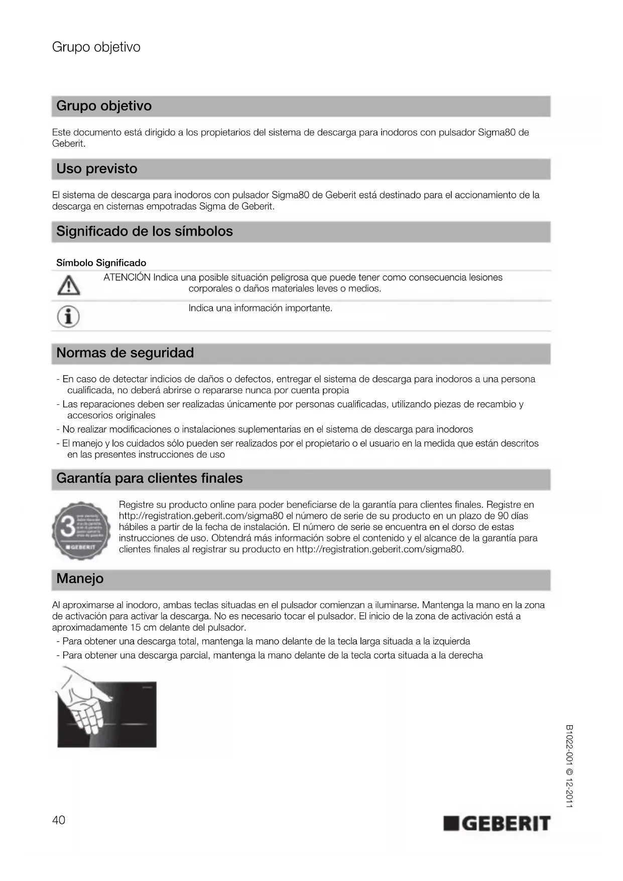 Bestanddelen Dit product voldoet aan de eisen van de richtlijn 2002/95/EG RoHS (beperking van het gebruik van bepaalde gevaarlijke stoffen in elektrische en elektronische apparatuur). Verwijdering als afval In het kader van de richtlijn 2002/96/EG WEEE betreffende afgedankte elektrische en elektronische apparatuur (AEEA) zijn fabrikanten van elektrische apparatuur verplicht oude apparaten terug te nemen en correct als afval te verwijderen. Het symbool geeft aan dat het product niet met normaal afval mag worden weggegooid. Oude apparaten moeten voor vakkundige verwijdering als afval direct aan Geberit worden geretourneerd. Inleveradressen kunnen bij het verantwoordelijke Geberit Geberit verkoopkantoor of via www.geberit.com worden aangevraagd . Schoonhouden Bedieningsplaat reinigen VOORZICHTIG Agressieve en schurende reinigingsmiddelen kunnen het oppervlak beschadigen. Geen chloor- of zuurhoudende, schurende of bijtende reinigingsmiddelen gebruiken ` Bedieningsplaat met milde reinigingsmiddelen en water reinigen. ` Een zachte doek gebruiken. Voor het reinigen van de bedieningsplaat beveelt Geberit de Geberit AquaClean reinigingsset aan (artikelnummer 242.547.00.1). Verwijdering als afval40 Grupo objetivo B1022-001 © 12-2011 Este documento está dirigido a los propietarios del sistema de descarga para inodoros con pulsador Sigma80 de Geberit. El sistema de descarga para inodoros con pulsador Sigma80 de Geberit está destinado para el accionamiento de la descarga en cisternas empotradas Sigma de Geberit. - En caso de detectar indicios de daños o defectos, entregar el sistema de descarga para inodoros a una persona cualificada, no deberá abrirse o repararse nunca por cuenta propia - Las reparaciones deben ser realizadas únicamente por personas cualificadas, utilizando piezas de recambio y accesorios originales - No realizar modificaciones o instalaciones suplementarias en el sistema de descarga para inodoros - El manejo y los cuidados sólo pueden ser realizados por el propietario o el usuario en la medida que están descritos en las presentes instrucciones de uso Registre su producto online para poder beneficiarse de la garantía para clientes finales. Registre en http://registration.geberit.com/sigma80 el número de serie de su producto en un plazo de 90 días hábiles a partir de la fecha de instalación. El número de serie se encuentra en el dorso de estas instrucciones de uso. Obtendrá más información sobre el contenido y el alcance de la garantía para clientes finales al registrar su producto en http://registration.geberit.com/sigma80. Al aproximarse al inodoro, ambas teclas situadas en el pulsador comienzan a iluminarse. Mantenga la mano en la zona de activación para activar la descarga. No es necesario tocar el pulsador. El inicio de la zona de activación está a aproximadamente 15 cm delante del pulsador. - Para obtener una descarga total, mantenga la mano delante de la tecla larga situada a la izquierda - Para obtener una descarga parcial, mantenga la mano delante de la tecla corta situada a la derecha Grupo objetivo Uso previsto Significado de los símbolos Símbolo Significado ATENCIÓN Indica una posible situación peligrosa que puede tener como consecuencia lesiones corporales o daños materiales leves o medios. Indica una información importante. Normas de seguridad Garantía para clientes finales ManejoAjustes B1022-001 © 12-2011