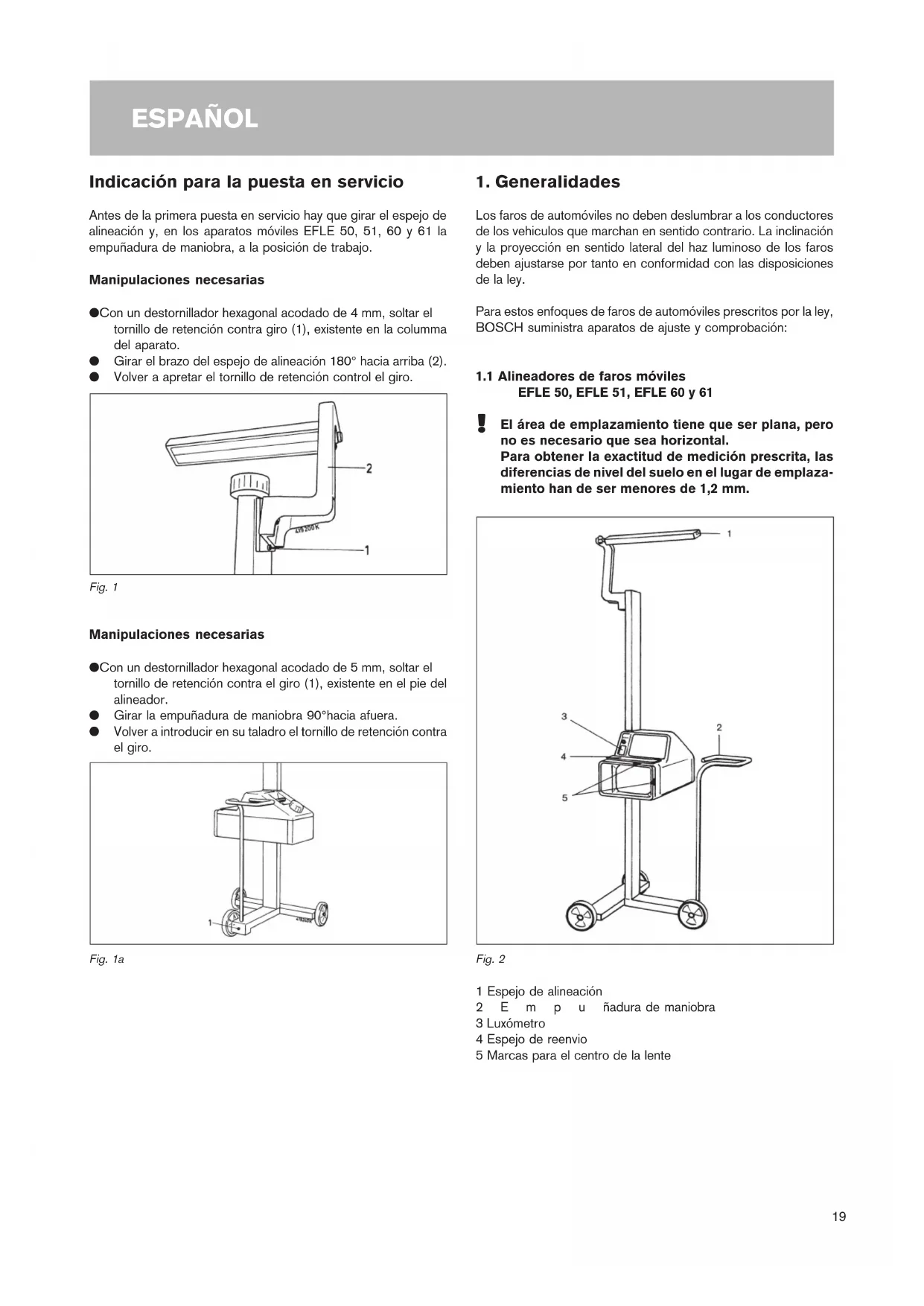 El alineador de faros es un aparato óptico de medición exacta. Para conservar esta exactitud de medición, deberia evitarse que el mismo recibiera golpes y un trato rudo, sin cuidado. A intervalos determinados deberia comprobarse la precisión de la indicación del alineador de faros. Ello es especialmente importante para talleres que realizan traba- jos en conformidad con las disposiciones de la ley. Además, recomendamos concertar un contrato de mantenimiento con el Servicio Bosch pertinente. La comprobación la realiza personal especializado con los aparatos correspondientes, según las especificaciones técnicas de la fábrica. Para la conservación, hay que lubricar de vez en cuando las ruedas con algunas gotas de aceite. ¡La columna de guía debe mantenerse seca, sin grasa ni aceite! La lente y el espejo deben mantenerse limpios, frotándolos con un paño suave.Указания по вводу в эксплуатацию Перед первым вводом в эксплуатацию выравнивающее зеркало и ручка у приборов EFLE 50,51,60 и 61 должны быть повернуты в рабочее положение. Необходимые ручные рычаги выравнивающего зеркала: (см. Рис.1) Необходимые ручные рычаги ручки: (см. Рис.1а)
