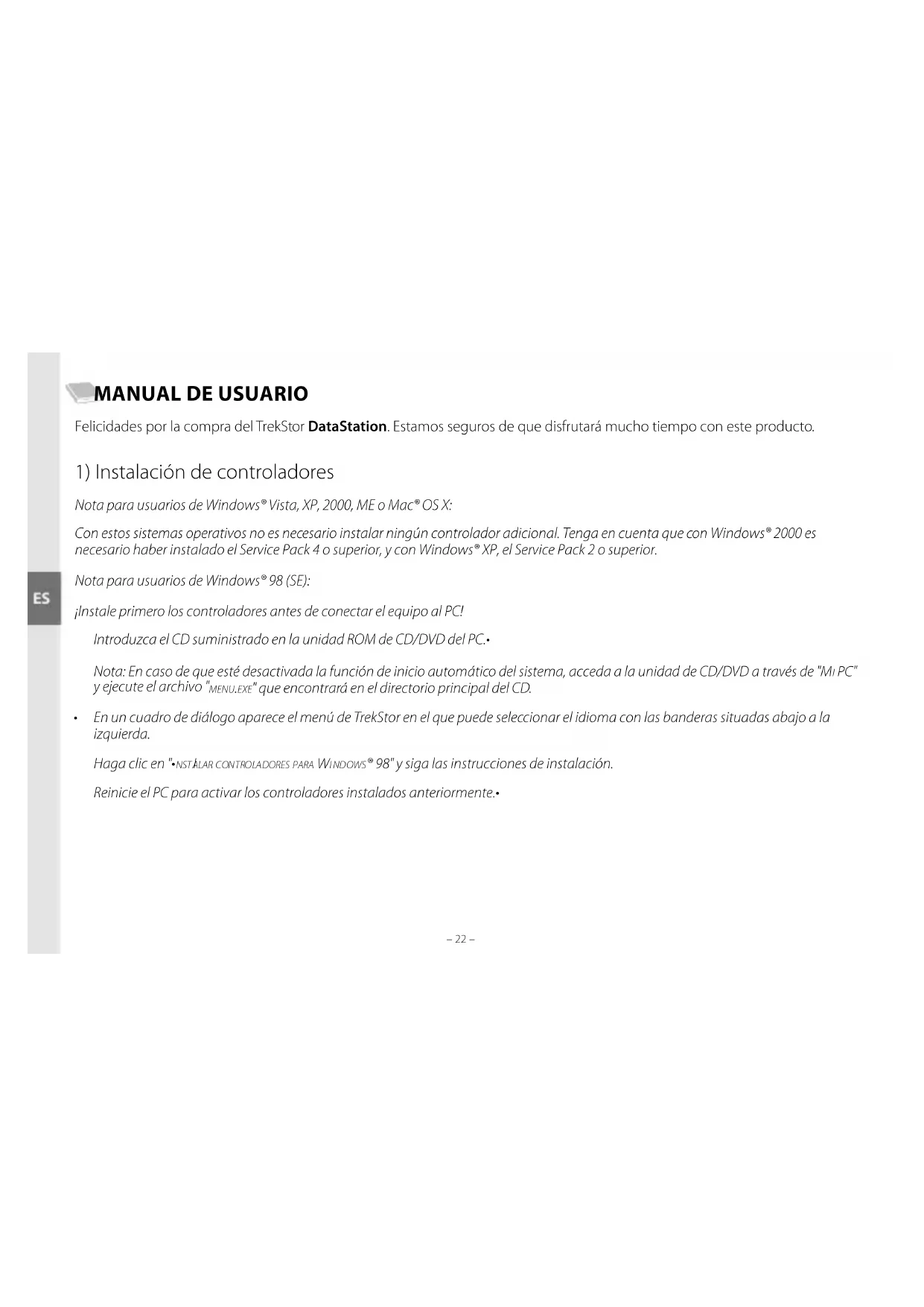 Nota para usuarios de Windows® Vista, XP, 2000, ME o Mac® OS X: Con estos sistemas operativos no es necesario instalar ningún controlador adicional. Tenga en cuenta que con Windows® 2000 es necesario haber instalado el Service Pack 4 o superior, y con Windows® XP, el Service Pack 2 o superior. Nota para usuarios de Windows® 98 (SE): ¡Instale primero los controladores antes de conectar el equipo al PC! Introduzca el CD suministrado en la unidad ROM de CD/DVD del PC.• Nota: En caso de que esté desactivada la función de inicio automático del sistema, acceda a la unidad de CD/DVD a través de "m i pC" y ejecute el archivo " m e n u .e x e " que encontrará en el directorio principal del CD. En un cuadro de diálogo aparece el menú de TrekStor en el que puede seleccionar el idioma con las banderas situadas abajo a la • izquierda. Haga clic en "• i n s t A l A r C o n t r o l A d o r e s p A r A Wi n d o W s ® 98" y siga las instrucciones de instalación. Reinicie el PC para activar los controladores instalados anteriormente.•– 22 – – 23 –