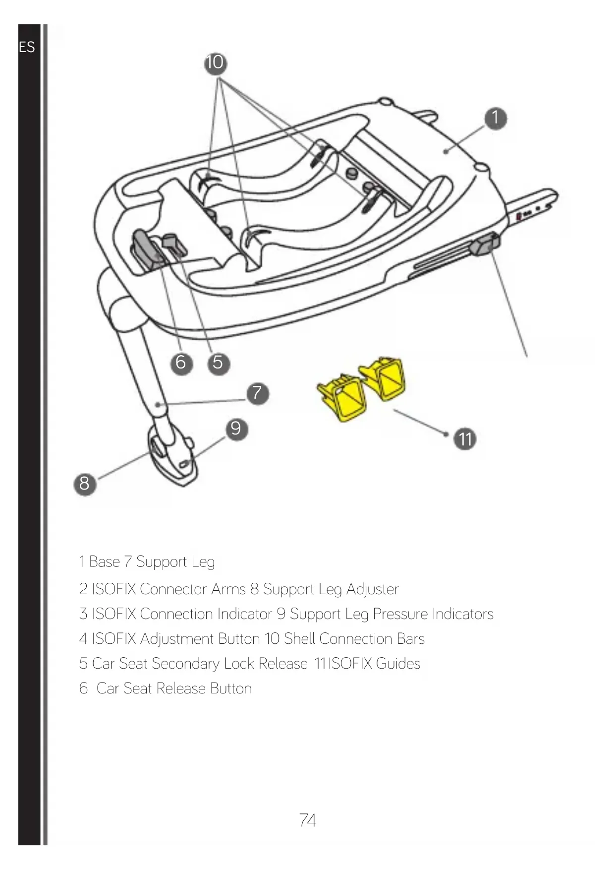- IMPORTANTE Lea todas las instrucciones de este manual y del manual del propietario ES75 1 Base 7 Support Leg 2 ISOFIX Connector Arms 8 Support Leg Adjuster 3 ISOFIX Connection Indicator 9 Support Leg Pressure Indicators 4 ISOFIX Adjustment Button 10 Shell Connection Bars 5 Car Seat Secondary Lock Release 11 ISOFIX Guides 6 Car Seat Release Button ADVERTENCIA