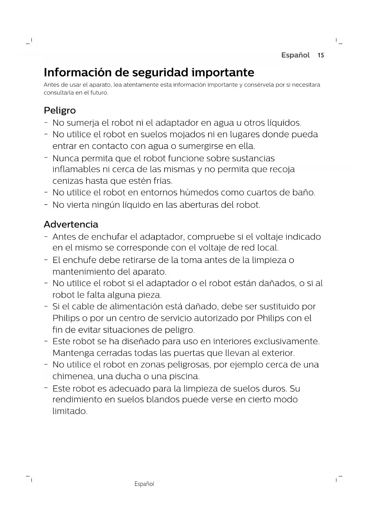 Español- Únicamente los ingenieros cualificados del servicio pueden reemplazar la batería recargable. Lleve el robot a un centro de servicio autorizado de Philips para que cambien la batería recargable cuando ya no pueda recargarla o cuando se quede sin energía rápidamente.