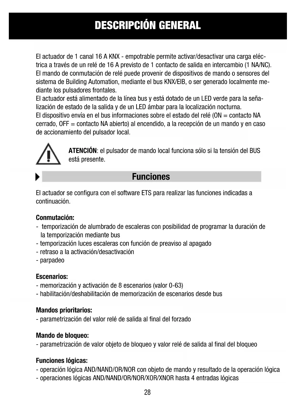 El actuator de 1 canal 16 A KNX - empotrable permite activar/desactivar una carga elec. trica a trovés de un relé de 16 A previsto de 1 contacto de salute en intercombio (1 NA/NC). El mando de conmutacion de relé puede provenir de dispositivos de mando o senseores del systema de Building Automation, mediante el bus KNX/EIB, o ser generationslamente mediente los pulsadores frontales.
