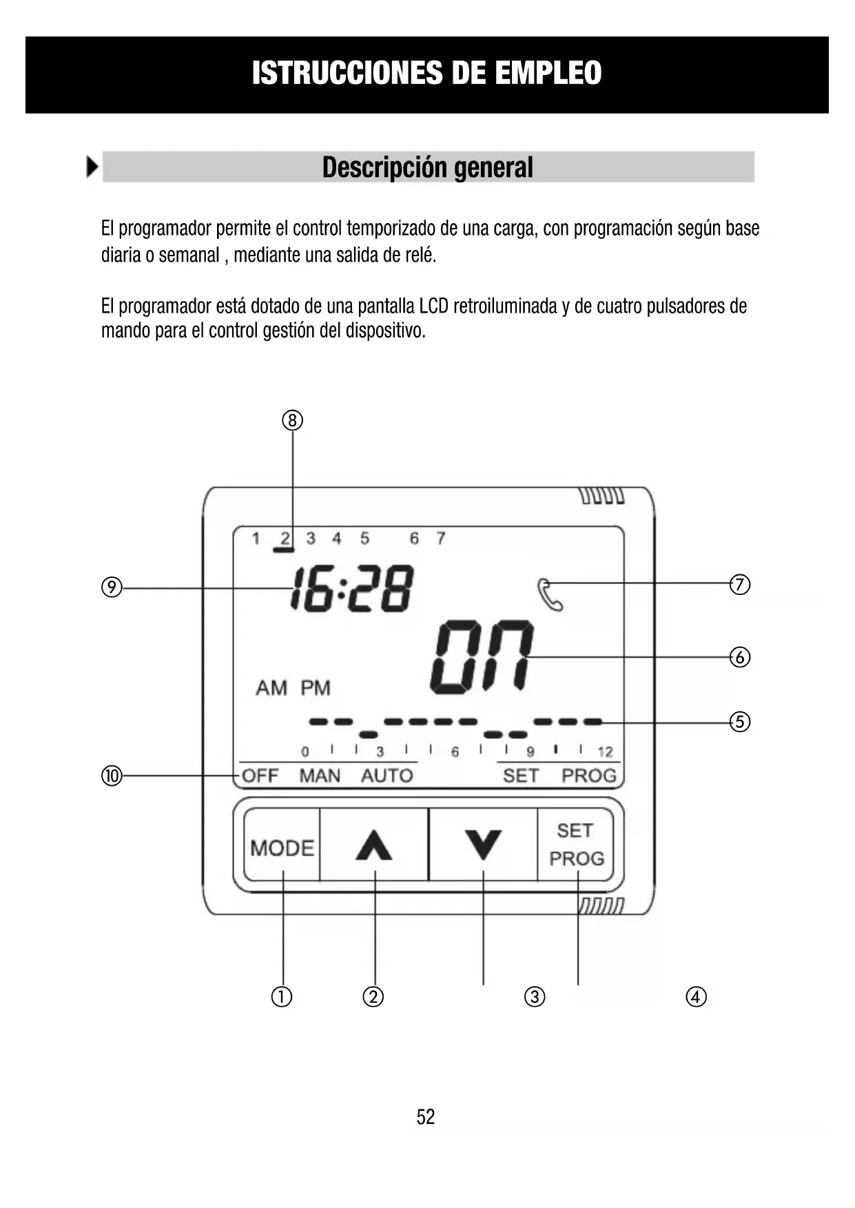 El programador está dotado de una pantalla LCD retroiluminada y de cuatro pulsadores de mando para el control gestión del dispositivo.