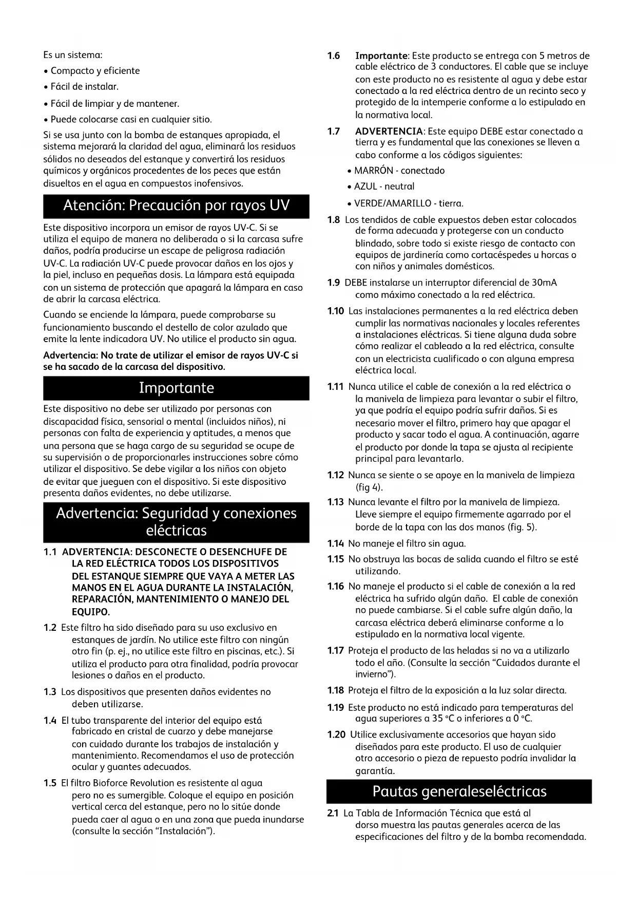 - Puede colocarse casi en cualquier sitio. Si se usa junto con la bomba de estanques apropiada, el sistema mejorará la claridad del agua, eliminará los residuos sólidos no deseados del estanque y convertirá los residuos químicos y orgánicos procedentes de los peces que están disueltos en el agua en compuestos inofensivos. Atención: Precaución por rayos UV Este dispositivo incorpora un emisor de rayos UV-C. Si se utiliza el equipo de manera no deliberada o si la carcasa sufre daños, podría producirse un escape de peligrosa radiación UV-C. La radiación UV-C puede provocar daños en los ojos y la piel, incluso en pequeñas dosis. La lámpara está equipada con un sistema de protección que apagará la lámpara en caso de abrir la carcasa eléctrica. Cuando se enciende la lámpara, puede comprobarse su funcionamiento buscando el destello de color azulado que emite la lente indicadora UV. No utilice el producto sin agua. Advertencia: No trate de utilizar el emisor de rayos UV-C si se ha sacado de la carcasa del dispositivo. Importante Este dispositivo no debe ser utilizado por personas con discapacidad física, sensorial o mental (incluidos niños), ni personas con falta de experiencia y aptitudes, a menos que una persona que se haga cargo de su seguridad se ocupe de su supervisión o de proporcionarles instrucciones sobre cómo utilizar el dispositivo. Se debe vigilar a los niños con objeto de evitar que jueguen con el dispositivo. Si este dispositivo presenta daños evidentes, no debe utilizarse. Advertencia: Seguridad y conexiones eléctricas