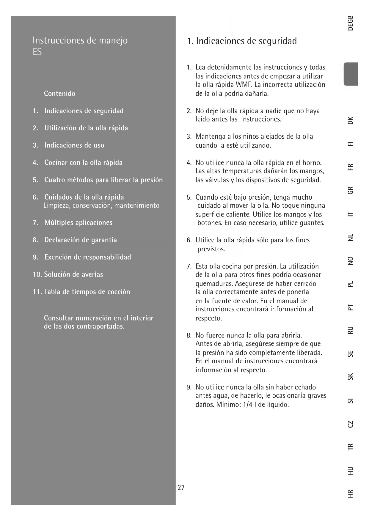 los dispositivos de seguridad, las válvulas y las juntas están en perfectas condiciones de funcionamiento. Sólo así se podrá garantizar el funcionamiento seguro de la olla. En el manual de instrucciones en- contrará información al respecto.
