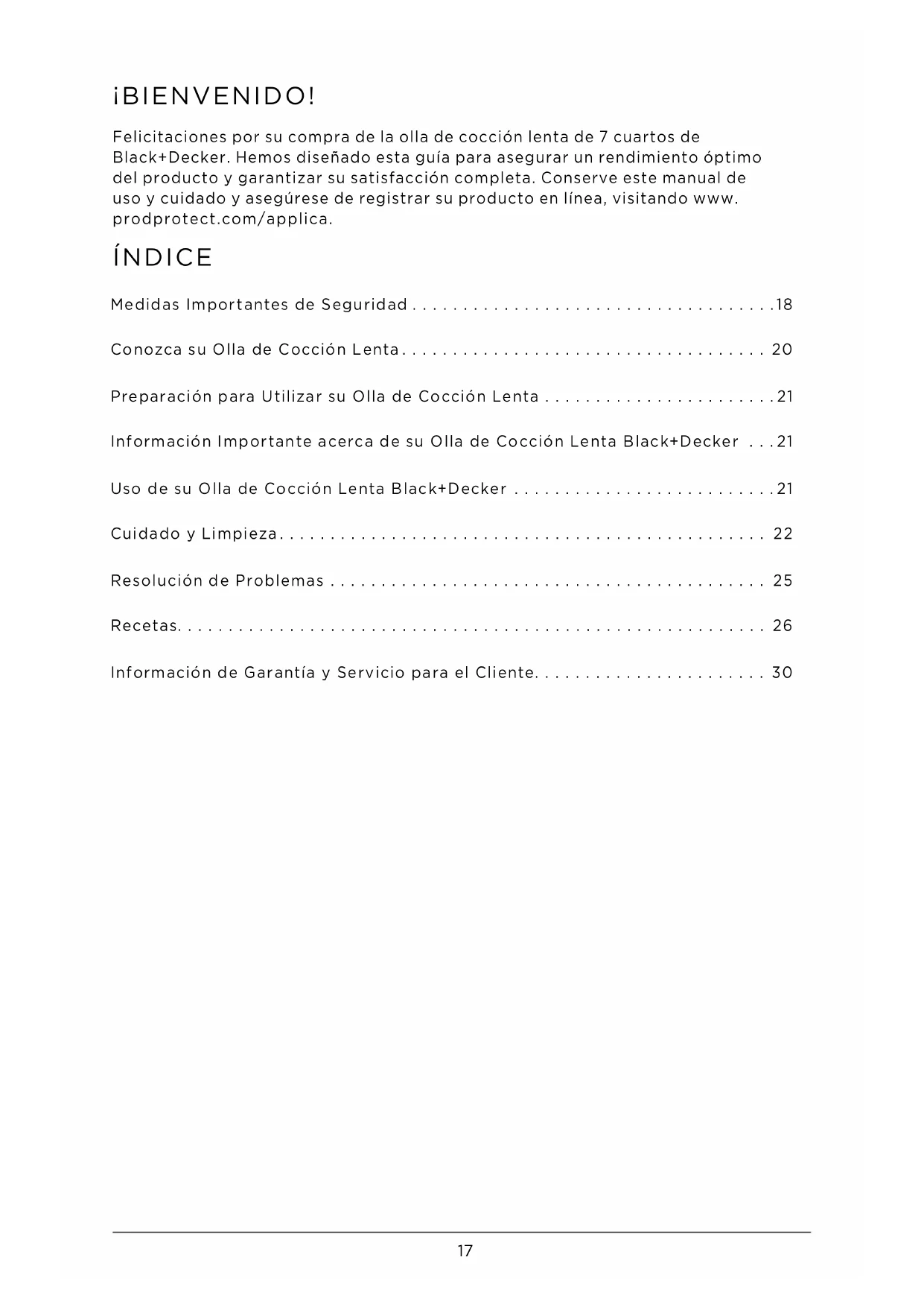 Felicitaciones por su compra de la olla de cocción lenta de 7 cuartos de Black+Decker. Hemos diseñado esta guía para asegurar un rendimiento óptimo del producto y garantizar su satisfacción completa. Conserve este manual de uso y cuidado y asegúrese de registrar su producto en línea, visitando www.prodprotect.com/applica.