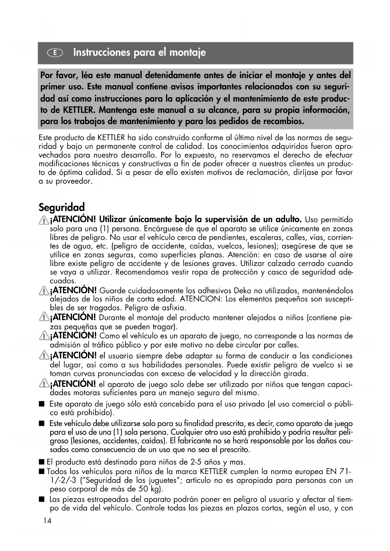 NL B14 Por favor, léa este manual detenidamente antes de iniciar el montaje y antes del primer uso. Este manual contiene avisos importantes relacionados con su seguri- dad así como instrucciones para la aplicación y el mantenimiento de este produc- to de KETTLER. Mantenga este manual a su alcance, para su propia información, para los trabajos de mantenimiento y para los pedidos de recambios. Este producto de KETTLER ha sido construido conforme al último nivel de las normas de segu- ridad y bajo un permanente control de calidad. Los conocimientos adquiridos fueron apro- vechados para nuestro desarrollo. Por lo expuesto, no reservamos el derecho de efectuar modificaciones técnicas y constructivas a fin de poder ofrecer a nuestros clientes un produc- to de óptima calidad. Si a pesar de ello existen motivos de reclamación, diríjase por favor a su proveedor. Seguridad ¡ATENCIÓN! Utilizar únicamente bajo la supervisión de un adulto. Uso permitido solo para una (1) persona. Encárguese de que el aparato se utilice únicamente en zonas libres de peligro. No usar el vehículo cerca de pendientes, escaleras, calles, vías, corrien- tes de agua, etc. (peligro de accidente, caídas, vuelcos, lesiones); asegúrese de que se utilice en zonas seguras, como superficies planas. Atención: en caso de usarse al aire libre existe peligro de accidente y de lesiones graves. Utilizar calzado cerrado cuando se vaya a utilizar. Recomendamos vestir ropa de protección y casco de seguridad ade- cuados. ¡ATENCIÓN! Guarde cuidadosamente los adhesivos Deko no utilizados, mantenéndolos alejados de los niños de corta edad. ATENCION: Los elementos pequeños son suscepti- bles de ser tragados. Peligro de asfixia. ¡ATENCIÓN! Durante el montaje del producto mantener alejados a niños (contiene pie- zas pequeñas que se pueden tragar). ¡ATENCIÓN! Como el vehículo es un aparato de juego, no corresponde a las normas de admisión al tráfico público y por este motivo no debe circular por calles. ¡ATENCIÓN! el usuario siempre debe adaptar su forma de conducir a las condiciones del lugar, así como a sus habilidades personales. Puede existir peligro de vuelco si se toman curvas pronunciadas con exceso de velocidad y la dirección girada. ¡ATENCIÓN! el aparato de juego solo debe ser utilizado por niños que tengan capaci- dades motoras suficientes para un manejo seguro del mismo. ■ Este aparato de juego sólo está concebido para el uso privado (el uso comercial o públi- co está prohibido). ■ Este vehículo debe utilizarse solo para su finalidad prescrita, es decir, como aparato de juego para el uso de una (1) sola persona. Cualquier otro uso está prohibido y podría resultar peli- groso (lesiones, accidentes, caídas). El fabricante no se hará responsable por los daños cau- sados como consecuencia de un uso que no sea el prescrito. ■ El producto está destinado para niños de 2-5 años y mas. ■ Todos los vehículos para niños de la marca KETTLER cumplen la norma europea EN 71- 1/-2/-3 (”Seguridad de los juguetes”; artículo no es apropiada para personas con un peso corporal de más de 50 kg). ■ Las piezas estropeadas del aparato podrán poner en peligro al usuario y afectar al tiem- po de vida del vehículo. Controle todas las piezas en plazos cortos, según el uso, y con Instrucciones para el montaje