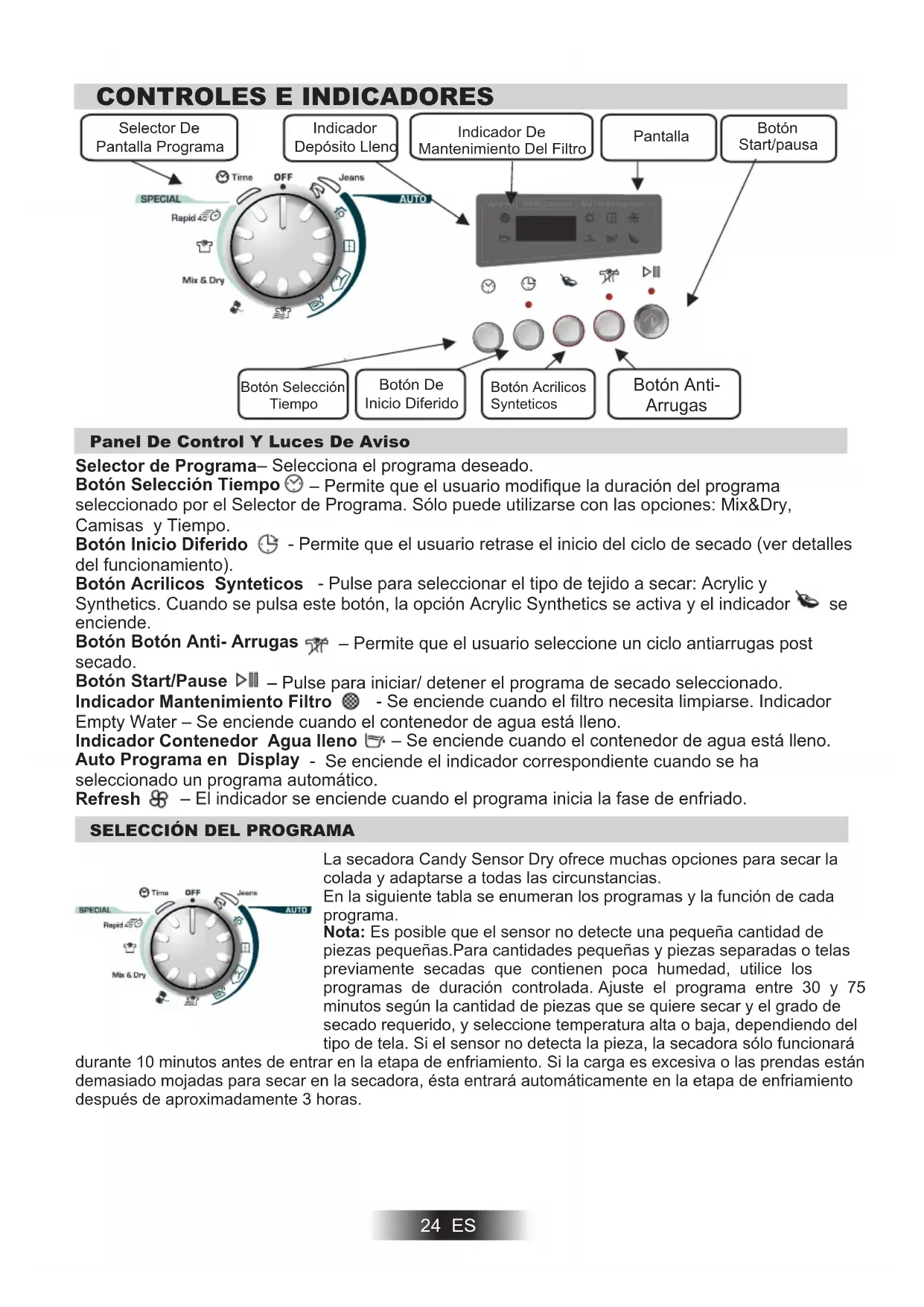 3. Gire selector programador para selectionar el programa de secado requirecido (vease Guía del Programa).