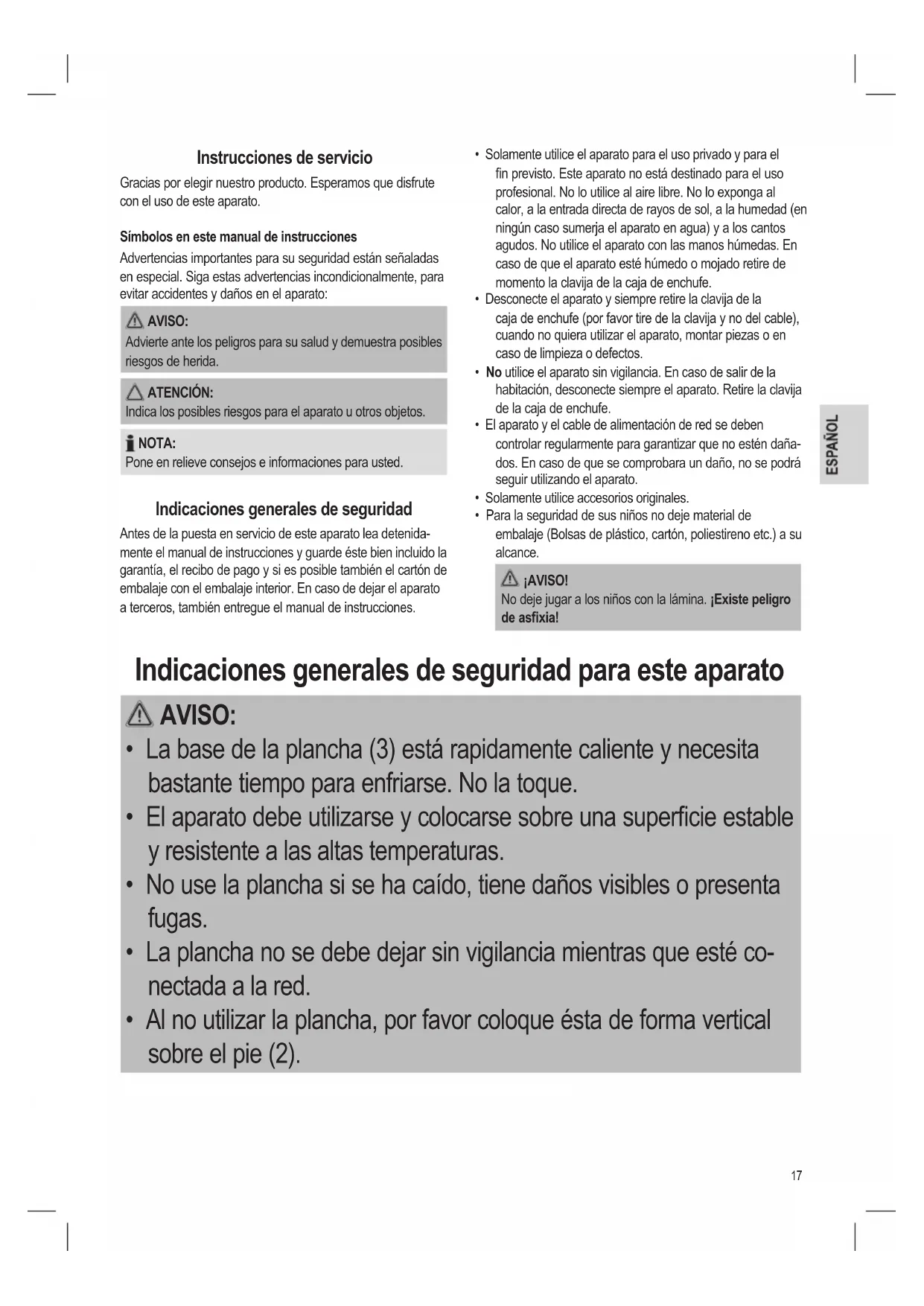 - Para la seguridad de sus niños no deje material de embalaje (Bolsas de plástico, cartón, poliestireno etc.) a su alcance. ¡AVISO! No deje jugar a los niños con la lámina. ¡Existe peligro de asxia! Indicaciones generales de seguridad para este aparato AVISO: