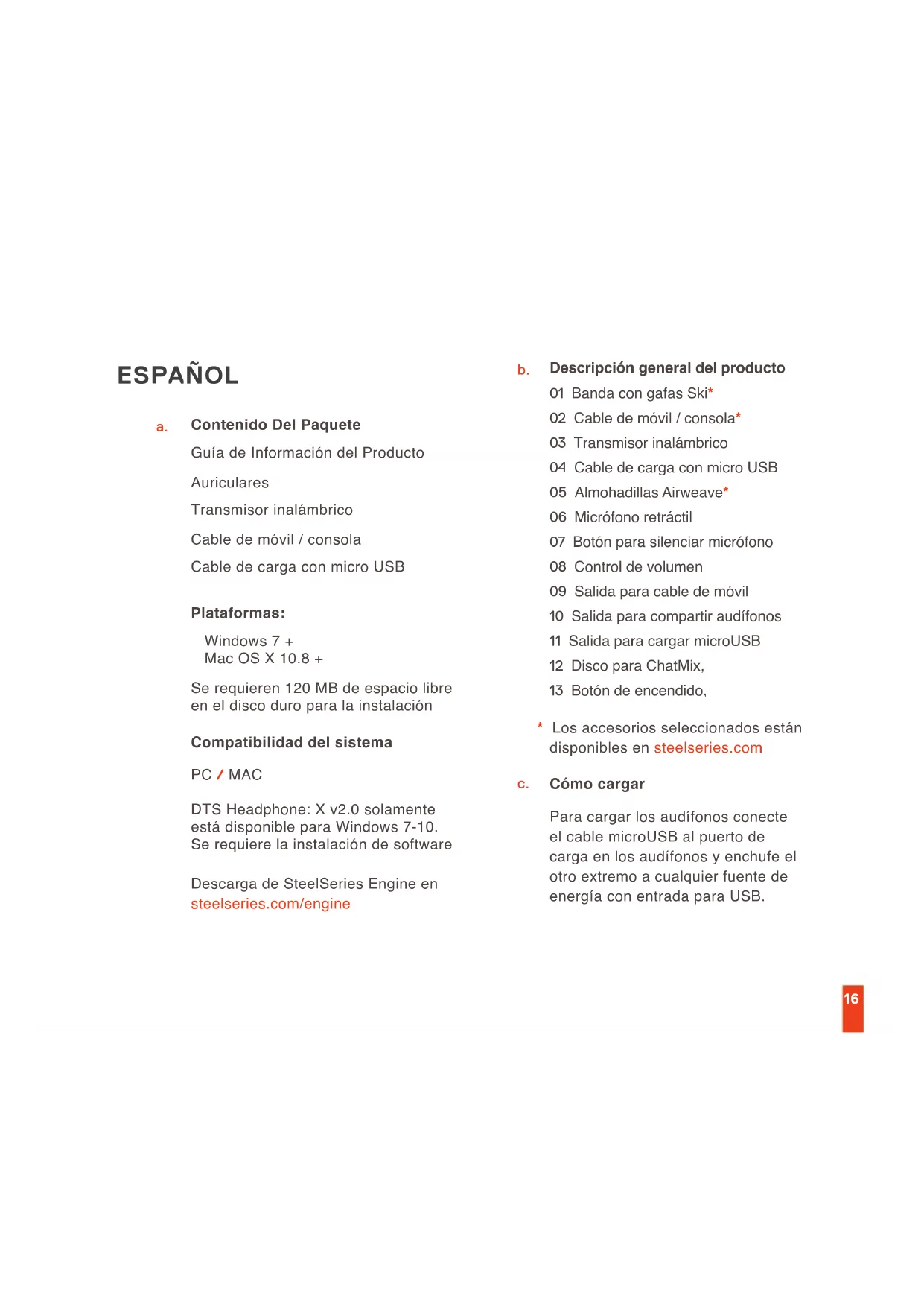 Contenido Del Paquete Guía de Información del Producto Auriculares Transmisor inalámbrico Cable de móvil / consola Cable de carga con micro USB Compatibilidad del sistema PC / MAC Plataformas: Windows 7 + Mac OS X 10.8 + Se requieren 120 MB de espacio libre en el disco duro para la instalación DTS Headphone: X v2.0 solamente está disponible para Windows 7-10. Se requiere la instalación de software Descripción general del producto 01 Banda con gafas Ski* 02 Cable de móvil / consola* 03 Transmisor inalámbrico 04 Cable de carga con micro USB 05 Almohadillas Airweave* 06 Micrófono retráctil 07 Botón para silenciar micrófono 08 Control de volumen 09 Salida para cable de móvil 10 Salida para compartir audífonos 11 Salida para cargar microUSB 12 Disco para ChatMix, 13 Botón de encendido, Cómo cargar Para cargar los audífonos conecte el cable microUSB al puerto de carga en los audífonos y enchufe el otro extremo a cualquier fuente de energía con entrada para USB.