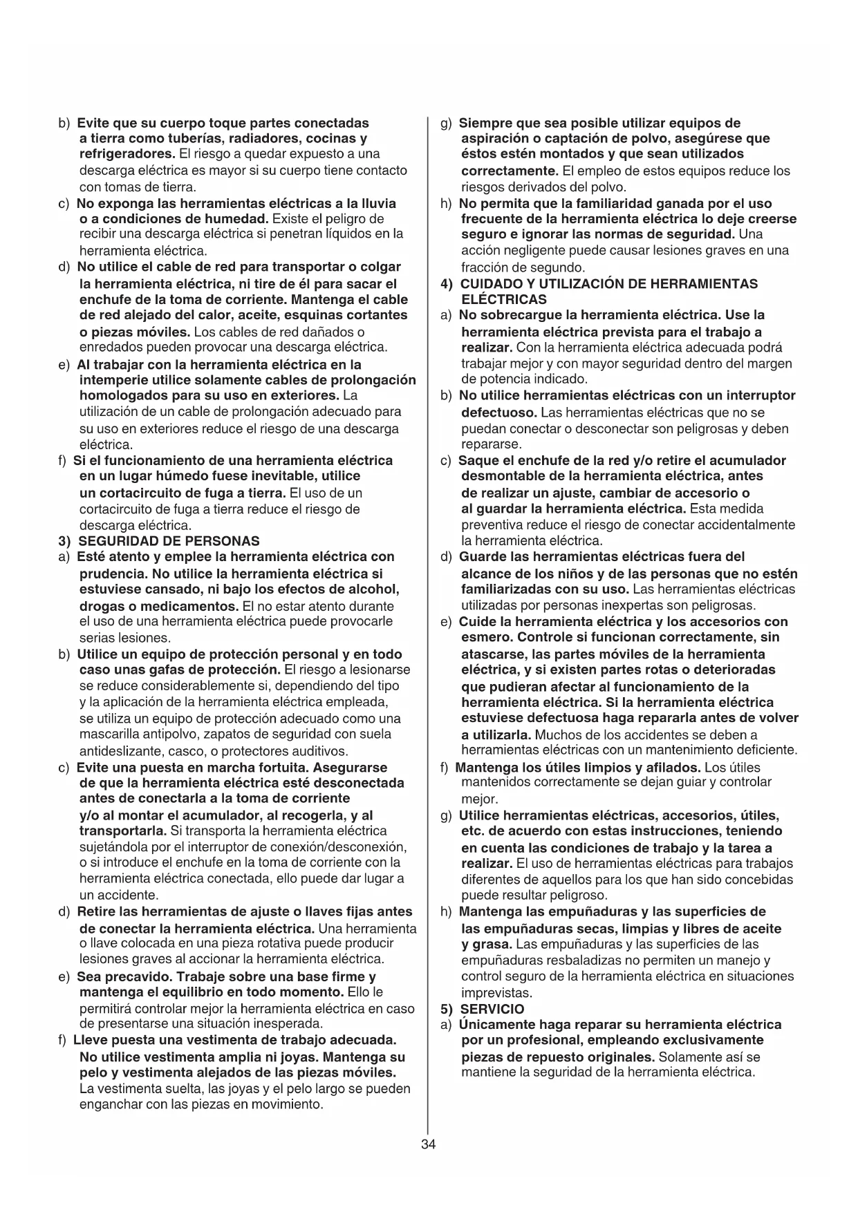 a) Esté atento y emplee la herramienta eléctrica con prudencia. No utilice la herramienta eléctrica si estuviese cansado, ni bajo los efectos de alcohol, drogas o medicamentos. El no estar atento durante el uso de una herramienta eléctrica puede provocarle serias lesiones. b) Utilice un equipo de protección personal y en todo caso unas gafas de protección. El riesgo a lesionarse se reduce considerablemente si, dependiendo del tipo y la aplicación de la herramienta eléctrica empleada, se utiliza un equipo de protección adecuado como una mascarilla antipolvo, zapatos de seguridad con suela antideslizante, casco, o protectores auditivos. c) Evite una puesta en marcha fortuita. Asegurarse de que la herramienta eléctrica esté desconectada antes de conectarla a la toma de corriente y/o al montar el acumulador, al recogerla, y al transportarla. Si transporta la herramienta eléctrica sujetándola por el interruptor de conexión/desconexión, o si introduce el enchufe en la toma de corriente con la herramienta eléctrica conectada, ello puede dar lugar a un accidente. d) Retire las herramientas de ajuste o llaves jas antes de conectar la herramienta eléctrica. Una herramienta o llave colocada en una pieza rotativa puede producir lesiones graves al accionar la herramienta eléctrica. e) Sea precavido. Trabaje sobre una base rme y mantenga el equilibrio en todo momento. Ello le permitirá controlar mejor la herramienta eléctrica en caso de presentarse una situación inesperada. f) Lleve puesta una vestimenta de trabajo adecuada. No utilice vestimenta amplia ni joyas. Mantenga su pelo y vestimenta alejados de las piezas móviles. La vestimenta suelta, las joyas y el pelo largo se pueden enganchar con las piezas en movimiento.35