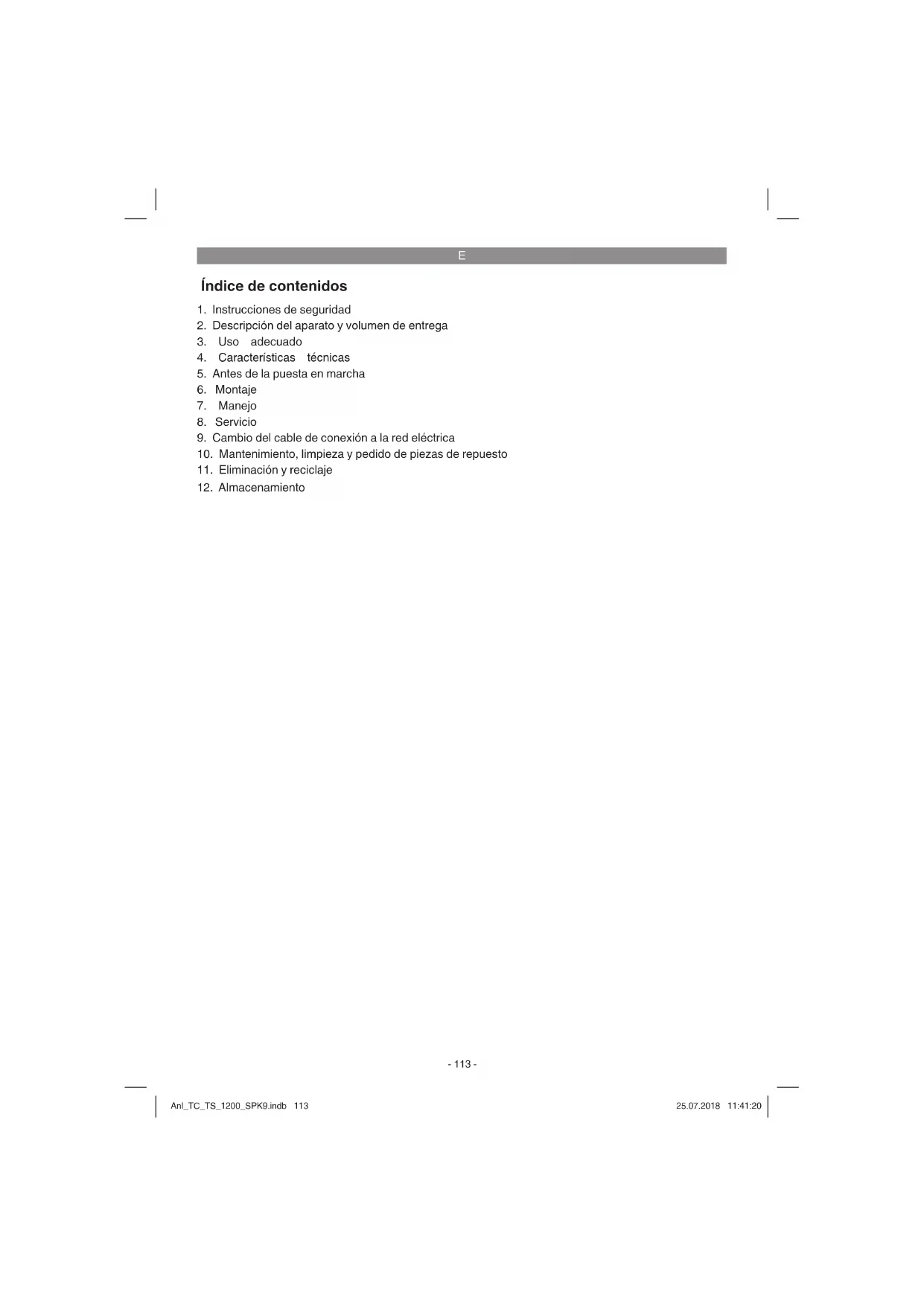 Sólo para países miembros de la UE No tirar herramientas eléctricas en la basura casera. Según la directiva europea 2012/19/CE sobre aparatos usados electrónicos y eléctricos y su aplicación en el derecho nacional, dichos aparatos deberán recojerse por separado y eliminarse de modo ecológi- co para facilitar su posterior reciclaje. Alternativa de reciclaje en caso de devolución: El propietario del aparato eléctrico, en caso de no optar por su devolución, está obligado a reciclar ade- cuadamente dicho aparato eléctrico. Para ello, también se puede entregar el aparato usado a un centro de reciclaje que trate la eliminación de residuos respetando la legislación nacional sobre residuos y su reciclaje. Esto no afecta a los medios auxiliares ni a los accesorios sin componentes eléctricos que acompañan a los aparatos usados. Sólo está permitido copiar la documentación y documentos anexos del producto, o extractos de los mismos, con autorización expresa de iSC GmbH. Nos reservamos el derecho a realizar modifi caciones técnicas Anl_TC_TS_1200_SPK9.indb 122Anl_TC_TS_1200_SPK9.indb 122 25.07.2018 11:41:2125.07.2018 11:41:21E