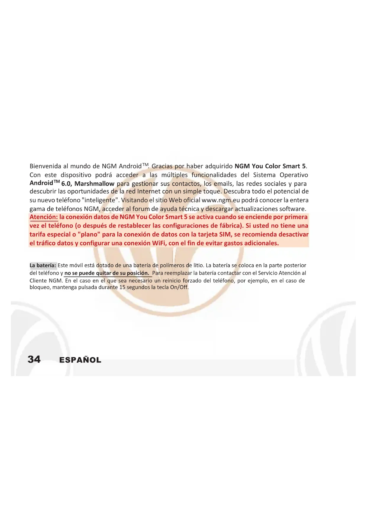 6.0, Marshmallow para gestionar sus contactos, los emails, las redes sociales y para descubrir las oportunidades de la red Internet con un simple toque. Descubra todo el potencial de su nuevo teléfono "inteligente". Visitando el sitio Web oficial www.ngm.eu podrá conocer la entera gama de teléfonos NGM, acceder al forum de ayuda técnica y descargar actualizaciones software. Atención: la conexión datos de NGM You Color Smart 5 se activa cuando se enciende por primera vez el teléfono (o después de restablecer las configuraciones de fábrica). Si usted no tiene una tarifa especial o "plano" para la conexión de datos con la tarjeta SIM, se recomienda desactivar el tráfico datos y configurar una conexión WiFi, con el fin de evitar gastos adicionales.
