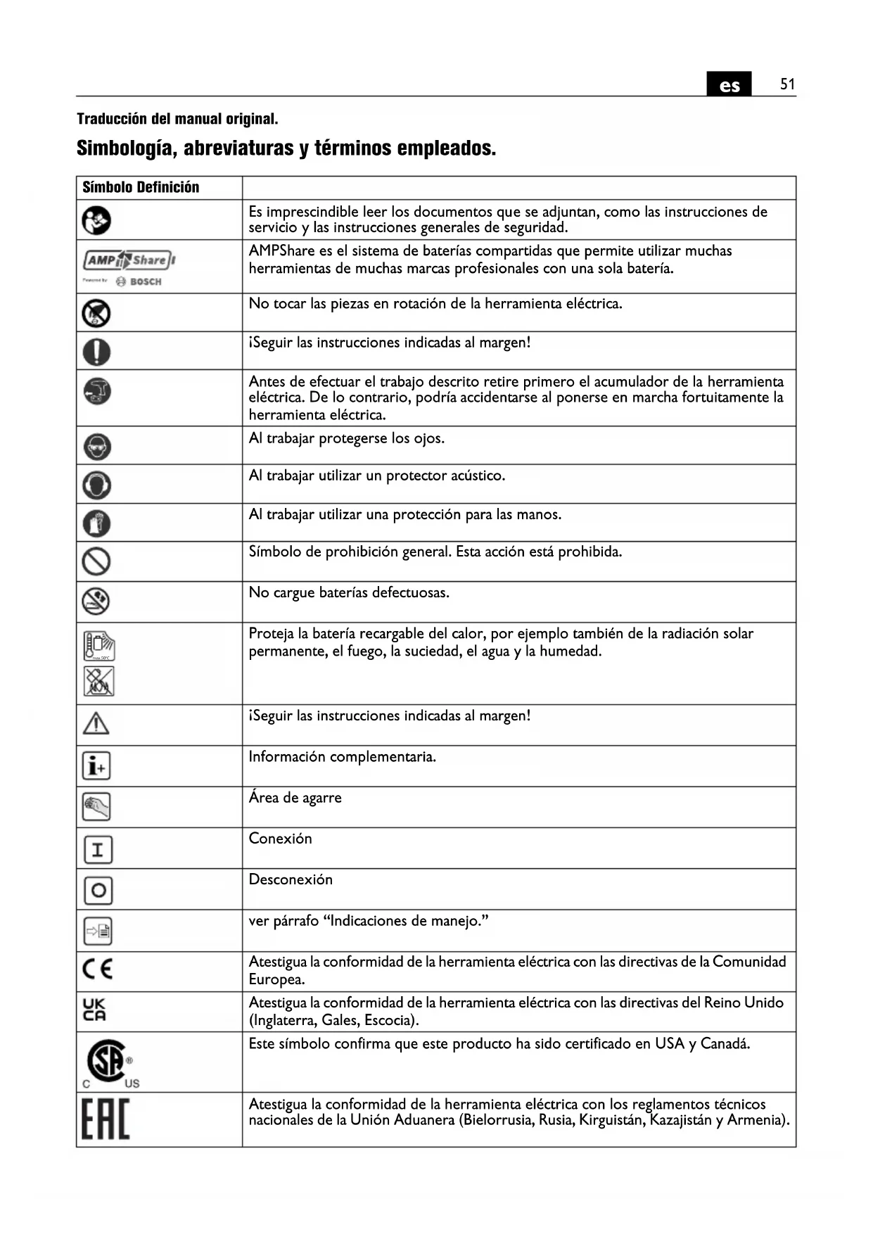 | EAC | Atestigua la conformidad de la herramipta electrica con los relogimientos tícnicos naciales de la Unión Aduanera (Bielorrusia, Rusia, Kirguistán, Kazajistán y Armenia). |