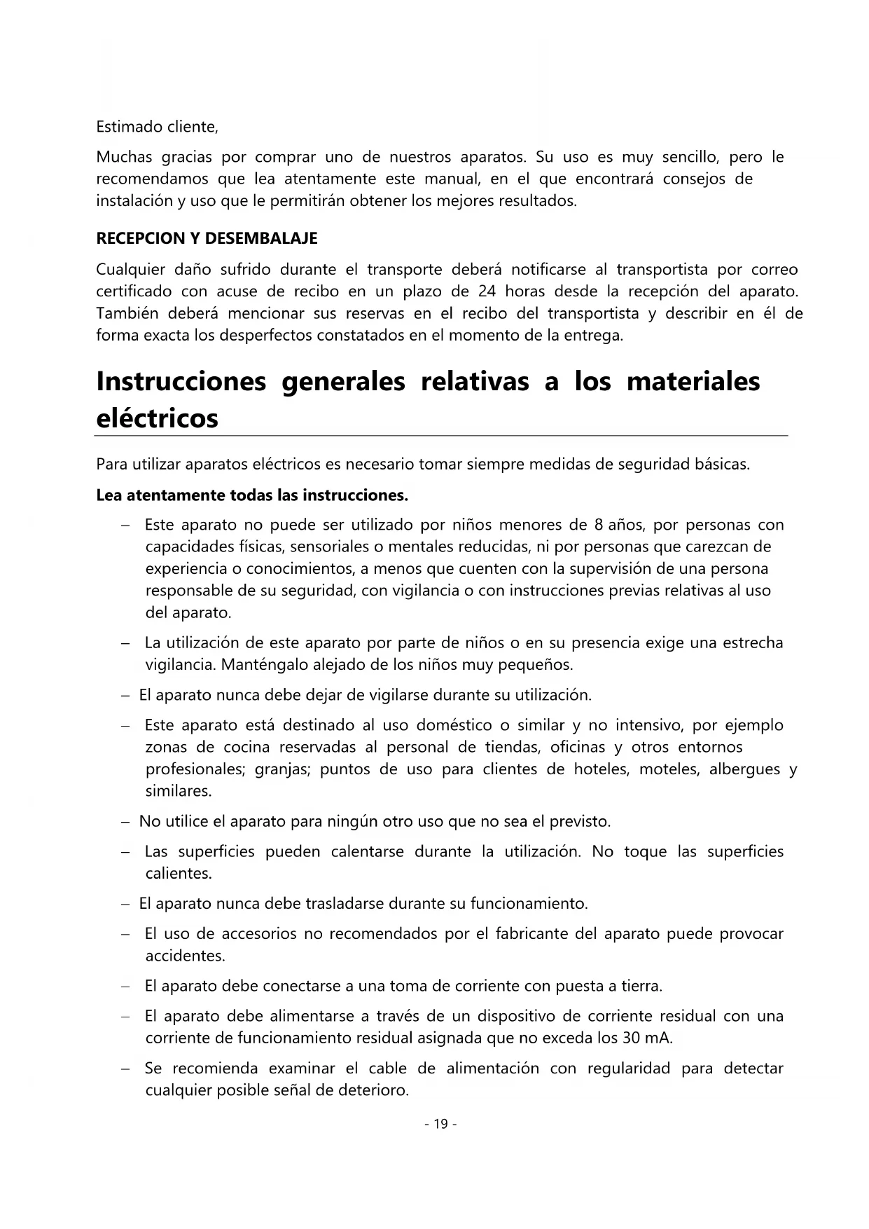 - Advertencia: no utilise este aparato con carbón o fuentes de energia distinctas de la prevista (electricidad).