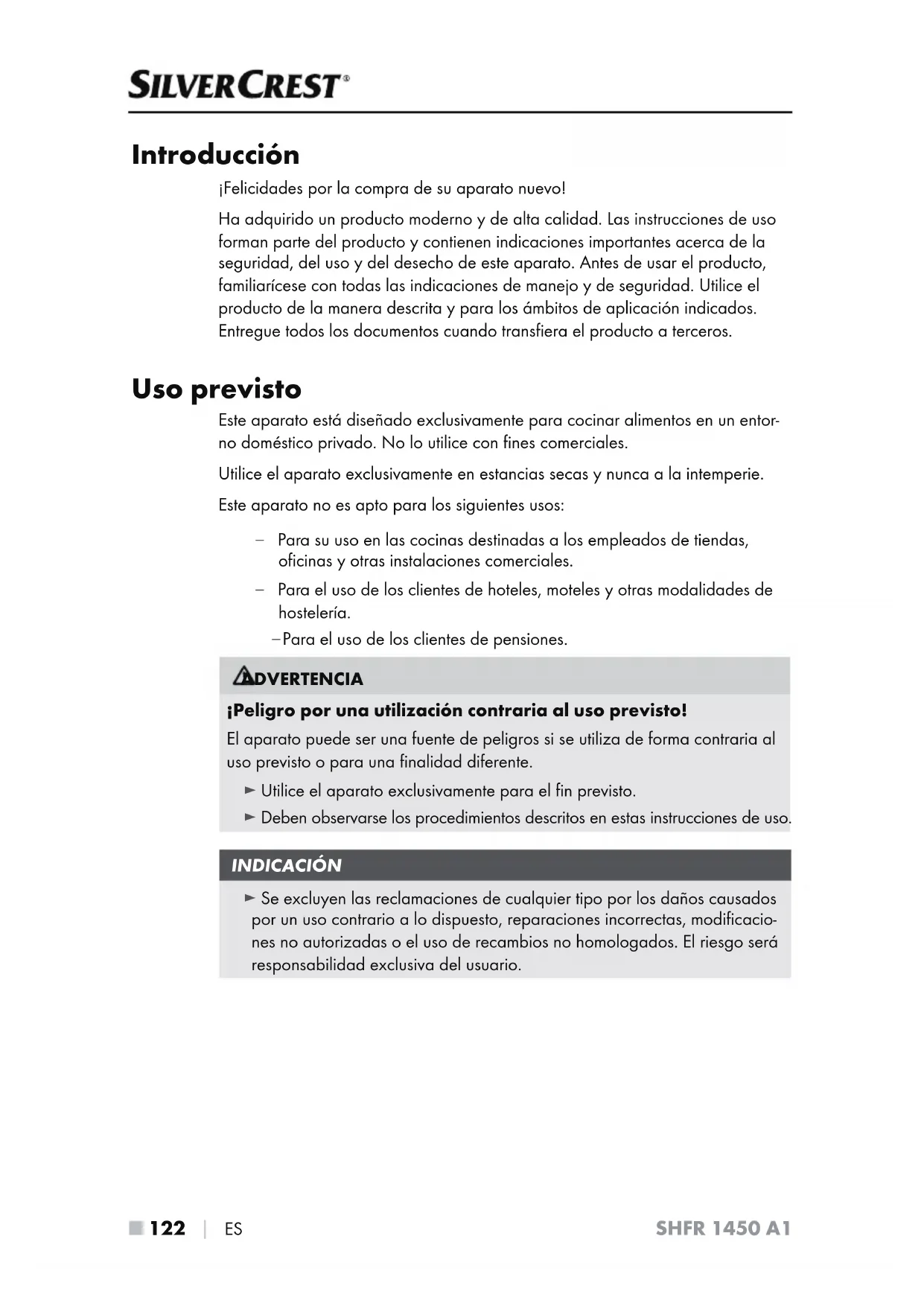 Entregue todos los documentos cuando transfiera el producto a terceros. Uso previsto Este aparato está diseñado exclusivamente para cocinar alimentos en un entor- no doméstico privado. No lo utilice con fines comerciales. Utilice el aparato exclusivamente en estancias secas y nunca a la intemperie. Este aparato no es apto para los siguientes usos: – Para su uso en las cocinas destinadas a los empleados de tiendas, oficinas y otras instalaciones comerciales. – Para el uso de los clientes de hoteles, moteles y otras modalidades de hostelería. – Para el uso de los clientes de pensiones. ADVERTENCIA ¡Peligro por una utilización contraria al uso previsto! El aparato puede ser una fuente de peligros si se utiliza de forma contraria al uso previsto o para una finalidad diferente. ► Utilice el aparato exclusivamente para el fin previsto. ► Deben observarse los procedimientos descritos en estas instrucciones de uso. INDICACIÓN ► Se excluyen las reclamaciones de cualquier tipo por los daños causados por un uso contrario a lo dispuesto, reparaciones incorrectas, modificacio- nes no autorizadas o el uso de recambios no homologados. El riesgo será responsabilidad exclusiva del usuario.ES