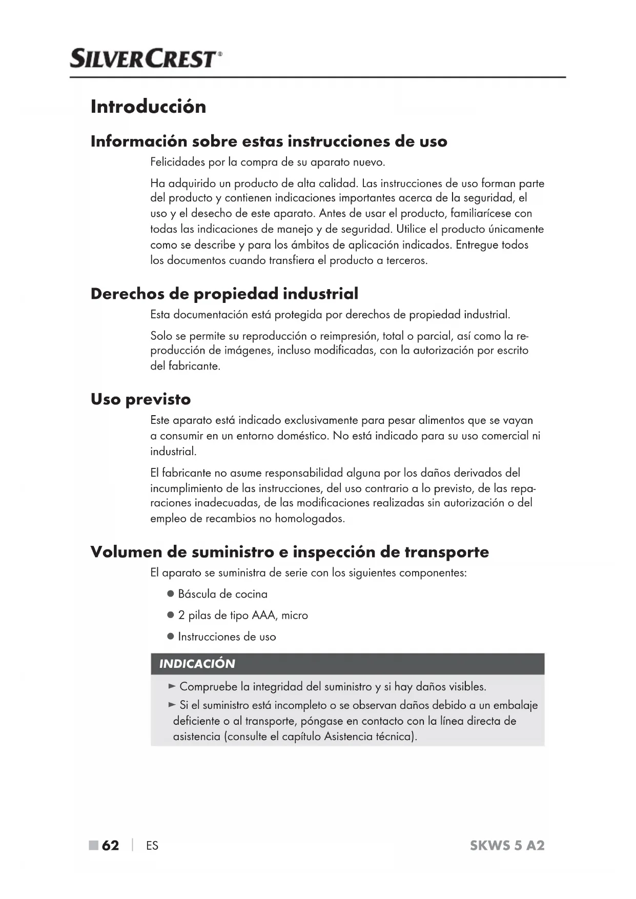ES SKWS 5 A2 Introducción Información sobre estas instrucciones de uso Felicidades por la compra de su aparato nuevo. Ha adquirido un producto de alta calidad. Las instrucciones de uso forman parte del producto y contienen indicaciones importantes acerca de la seguridad, el uso y el desecho de este aparato. Antes de usar el producto, familiarícese con todas las indicaciones de manejo y de seguridad. Utilice el producto únicamente como se describe y para los ámbitos de aplicación indicados. Entregue todos los documentos cuando transfiera el producto a terceros. Derechos de propiedad industrial Esta documentación está protegida por derechos de propiedad industrial. Solo se permite su reproducción o reimpresión, total o parcial, así como la re- producción de imágenes, incluso modificadas, con la autorización por escrito del fabricante. Uso previsto Este aparato está indicado exclusivamente para pesar alimentos que se vayan a consumir en un entorno doméstico. No está indicado para su uso comercial ni industrial. El fabricante no asume responsabilidad alguna por los daños derivados del incumplimiento de las instrucciones, del uso contrario a lo previsto, de las repa- raciones inadecuadas, de las modificaciones realizadas sin autorización o del empleo de recambios no homologados. Volumen de suministro e inspección de transporte El aparato se suministra de serie con los siguientes componentes: ● Báscula de cocina ● 2 pilas de tipo AAA, micro ● Instrucciones de uso INDICACIÓN ► Compruebe la integridad del suministro y si hay daños visibles. ► Si el suministro está incompleto o se observan daños debido a un embalaje deficiente o al transporte, póngase en contacto con la línea directa de asistencia (consulte el capítulo Asistencia técnica).ES