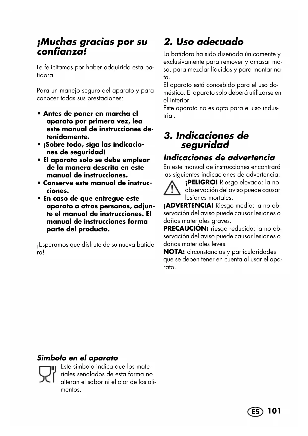 - En caso de que entregue este aparato a otras personas, adjun- te el manual de instrucciones. El manual de instrucciones forma parte del producto. ¡Esperamos que disfrute de su nueva batido- ra! Símbolo en el aparato Este símbolo indica que los mate- riales señalados de esta forma no alteran el sabor ni el olor de los ali- mentos.