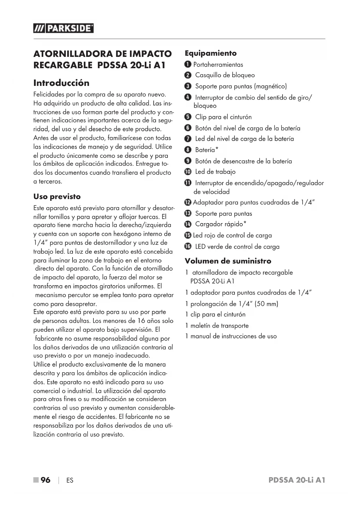 RECARGABLE PDSSA 20-Li A1 Introducción Felicidades por la compra de su aparato nuevo. Ha adquirido un producto de alta calidad. Las ins- trucciones de uso forman parte del producto y con- tienen indicaciones importantes acerca de la segu- ridad, del uso y del desecho de este producto. Antes de usar el producto, familiarícese con todas las indicaciones de manejo y de seguridad. Utilice el producto únicamente como se describe y para los ámbitos de aplicación indicados. Entregue to- dos los documentos cuando transfiera el producto a terceros. Uso previsto Este aparato está previsto para atornillar y desator- nillar tornillos y para apretar y aflojar tuercas. El aparato tiene marcha hacia la derecha/izquierda y cuenta con un soporte con hexágono interno de 1/4” para puntas de destornillador y una luz de trabajo led. La luz de este aparato está concebida para iluminar la zona de trabajo en el entorno directo del aparato. Con la función de atornillado de impacto del aparato, la fuerza del motor se transforma en impactos giratorios uniformes. El mecanismo percutor se emplea tanto para apretar como para desapretar. Este aparato está previsto para su uso por parte de personas adultas. Los menores de 16años solo pueden utilizar el aparato bajo supervisión. El fabricante no asume responsabilidad alguna por los daños derivados de una utilización contraria al uso previsto o por un manejo inadecuado. Utilice el producto exclusivamente de la manera descrita y para los ámbitos de aplicación indica- dos. Este aparato no está indicado para su uso comercial o industrial. La utilización del aparato para otros fines o su modificación se consideran contrarias al uso previsto y aumentan considerable- mente el riesgo de accidentes. El fabricante no se responsabiliza por los daños derivados de una uti- lización contraria al uso previsto. Equipamiento Portaherramientas Casquillo de bloqueo Soporte para puntas (magnético) Interruptor de cambio del sentido de giro/ bloqueo Clip para el cinturón Botón del nivel de carga de la batería Led del nivel de carga de la batería Batería* Botón de desencastre de la batería Led de trabajo Interruptor de encendido/apagado/regulador de velocidad Adaptador para puntas cuadradas de 1/4” Soporte para puntas Cargador rápido* Led rojo de control de carga LED verde de control de carga Volumen de suministro 1 atornilladora de impacto recargable PDSSA 20-Li A1 1 adaptador para puntas cuadradas de 1/4” 1 prolongación de 1/4” (50mm) 1 clip para el cinturón 1 maletín de transporte 1manual de instrucciones de usoPDSSA 20-Li A1