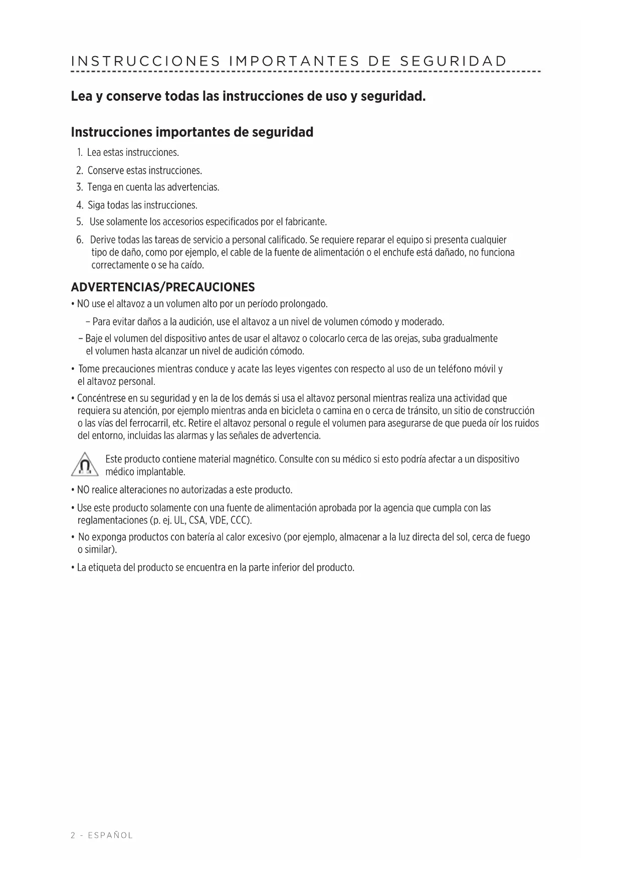 - Concéntrese en su seguridad y en la de los demás si usa el altavoz personal mientras realiza una actividad que requiera su atención, por ejemplo mientras anda en bicicleta o camina en o cerca de tránsito, un sitio de construcción o las vías del ferrocarril, etc. Retire el altavoz personal o regule el volumen para asegurarse de que pueda oír los ruidos del entorno, incluidas las alarmas y las señales de advertencia. Este producto contiene material magnético. Consulte con su médico si esto podría afectar a un dispositivo médico implantable.