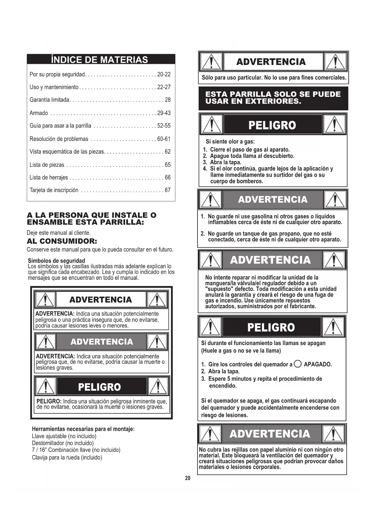 - PELIGRO ADVERTENCIA Sólo para uso particular. No lo use para fines comerciales.ESTA PARRILLA SOLO SE PUEDE USAR EN EXTERIORES. ADVERTENCIA No intente reparar ni modificar la unidad de la manguera/la válvula/el regulador debido a un "supuesto" defecto. Toda modificación a esta unidad anulará la garantía y creará el riesgo de una fuga de gas e incendio. Use únicamente repuestos autorizados, suministrados por el fabricante. PELIGRO Si durante el funcionamiento las llamas se apagan (Huele a gas o no se ve la llama)1. Gire los controles del quemador a APAGADO.2. Abra la tapa.3. Espere 5 minutos y repita el procedimiento de encendido.Si el quemador se apaga, el gas continuará escapando del quemador y puede accidentalmente encenderse con riesgo de lesiones. ADVERTENCIA No cubra las rejillas con papel aluminio ni con ningún otro material. Este bloqueará la ventilación del quemador y creará situaciones peligrosas que podrían provocar daños materiales o lesiones corporales. Por su propia seguridad p. 20