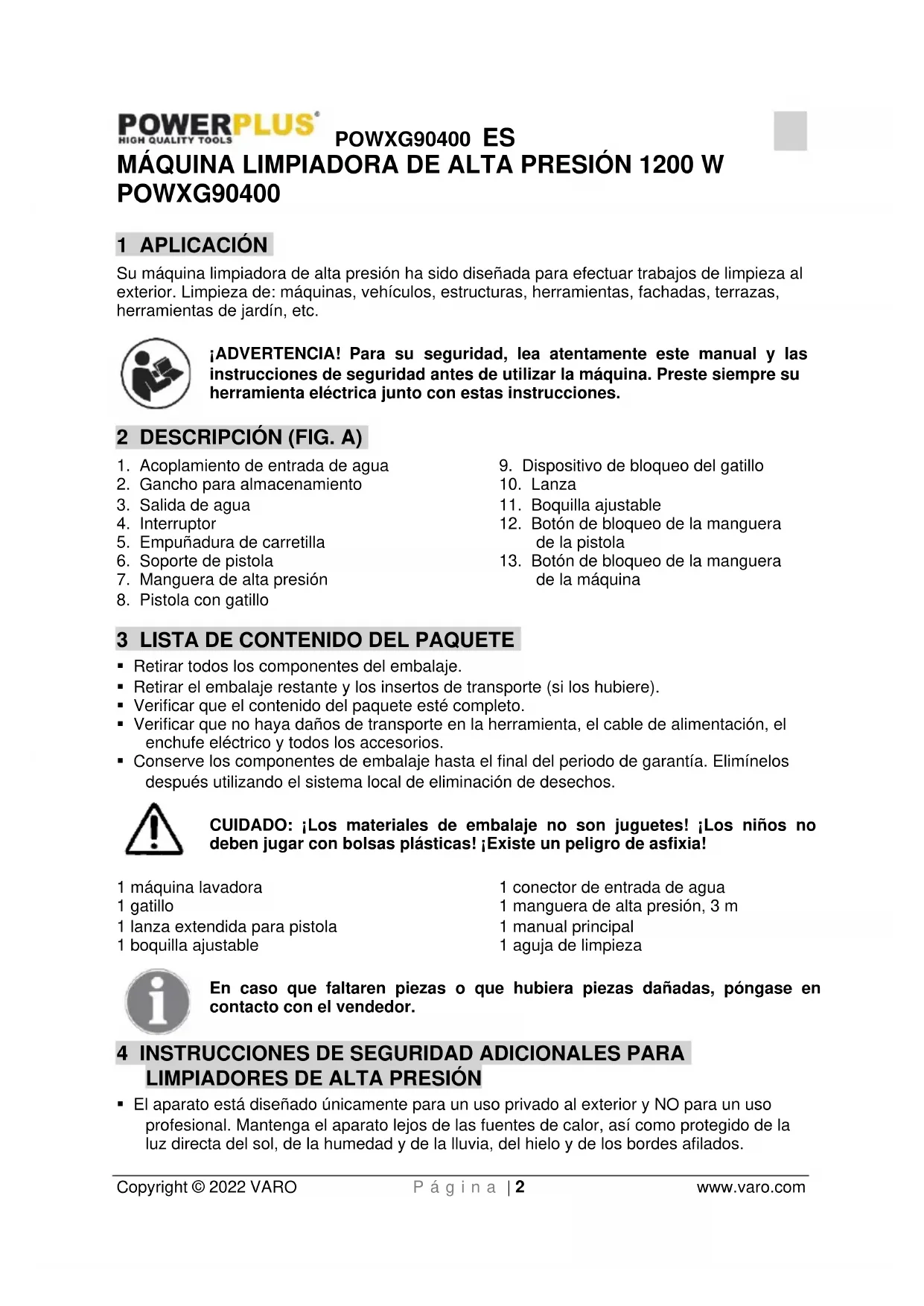 Copyright © 2022 VARO P á g i n a | 2 www.varo.com MÁQUINA LIMPIADORA DE ALTA PRESIÓN 1200 W POWXG90400 1 APLICACIÓN Su máquina limpiadora de alta presión ha sido diseñada para efectuar trabajos de limpieza al exterior. Limpieza de: máquinas, vehículos, estructuras, herramientas, fachadas, terrazas, herramientas de jardín, etc. ¡ADVERTENCIA! Para su seguridad, lea atentamente este manual y las instrucciones de seguridad antes de utilizar la máquina. Preste siempre su herramienta eléctrica junto con estas instrucciones. 2 DESCRIPCIÓN (FIG. A)