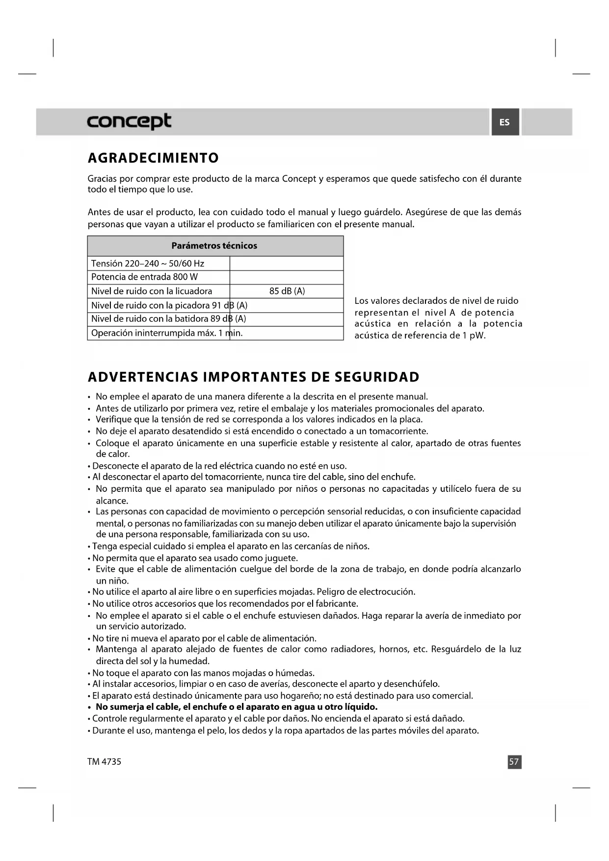 56 TM 4735AGRADECIMIENTO Gracias por comprar este producto de la marca Concept y esperamos que quede satisfecho con él durante todo el tiempo que lo use. Antes de usar el producto, lea con cuidado todo el manual y luego guárdelo. Asegúrese de que las demás personas que vayan a utilizar el producto se familiaricen con el presente manual. Parámetros técnicos Tensión 220–240 ~ 50/60 Hz Potencia de entrada 800 W Nivel de ruido con la licuadora 85 dB (A) Nivel de ruido con la picadora 91 dB (A) Nivel de ruido con la batidora 89 dB (A) Operación ininterrumpida máx. 1 min.