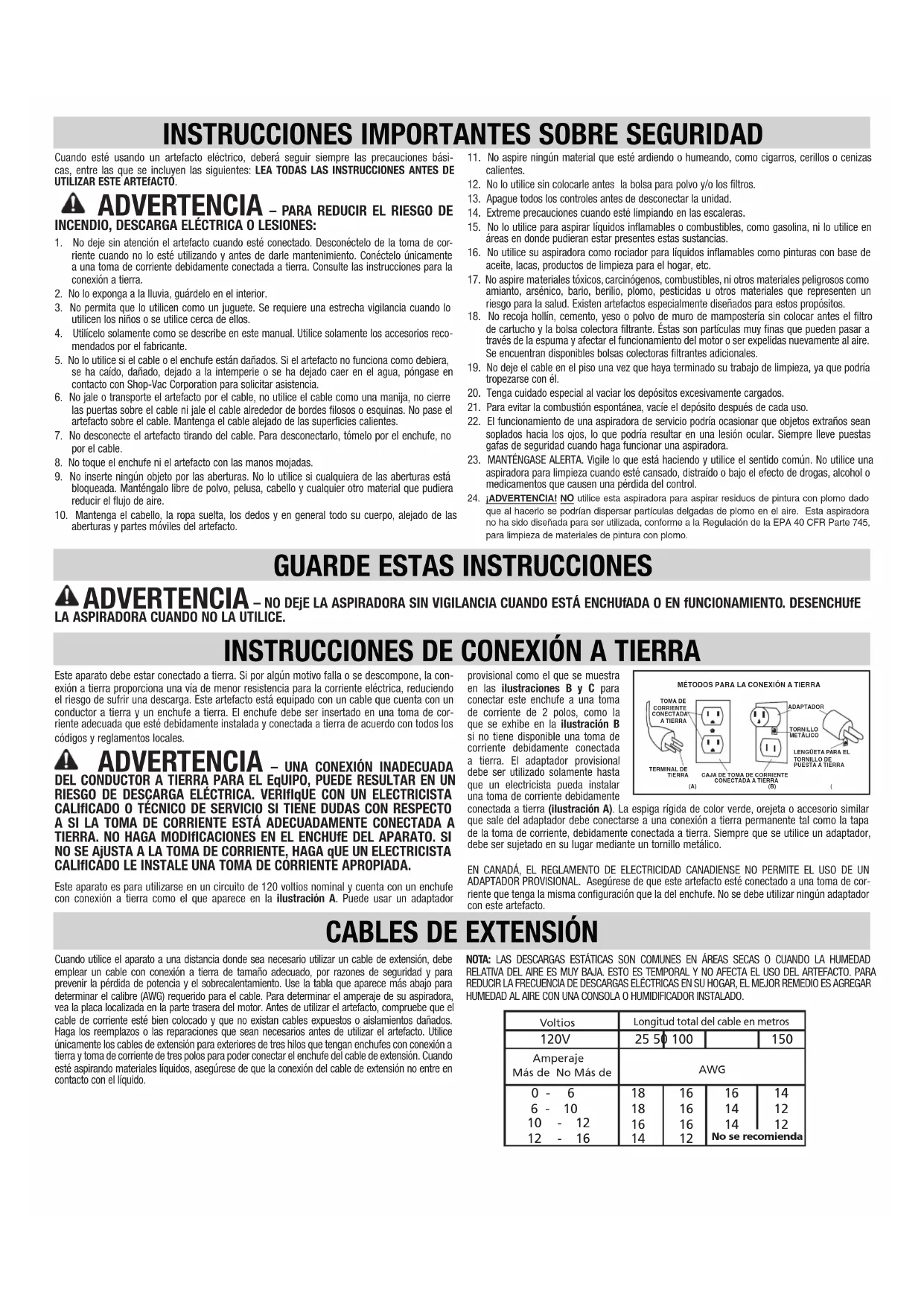 Cuando utilice el aparato a una distancia donde sea necesario utilizar un cable de extensión, debe emplear un cable con conexión a tierra de tamaño adecuado, por razones de seguridad y para prevenir la pérdida de potencia y el sobrecalentamiento. Use la tabla que aparece más abajo para determinar el calibre (AWG) requerido para el cable. Para determinar el amperaje de su aspiradora, vea la placa localizada en la parte trasera del motor. Antes de utilizar el artefacto, compruebe que el cable de corriente esté bien colocado y que no existan cables expuestos o aislamientos dañados. Haga los reemplazos o las reparaciones que sean necesarios antes de utilizar el artefacto. Utilice únicamente los cables de extensión para exteriores de tres hilos que tengan enchufes con conexión a tierra y toma de corriente de tres polos para poder conectar el enchufe del cable de extensión. Cuando esté aspirando materiales líquidos, asegúrese de que la conexión del cable de extensión no entre en contacto con el líquido.