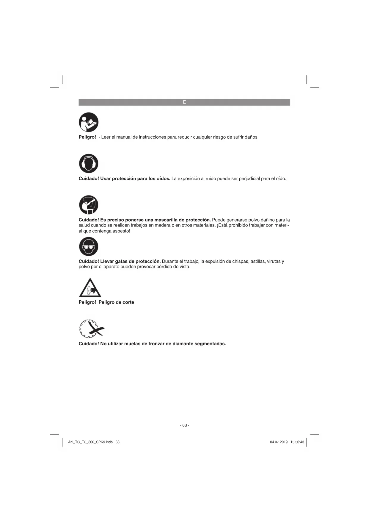Peligro! Peligro de corte Cuidado! No utilizar muelas de tronzar de diamante segmentadas. Peligro! - Leer el manual de instrucciones para reducir cualquier riesgo de sufrir daños Cuidado! Usar protección para los oídos. La exposición al ruido puede ser perjudicial para el oído. Cuidado! Llevar gafas de protección. Durante el trabajo, la expulsión de chispas, astillas, virutas y polvo por el aparato pueden provocar pérdida de vista. Cuidado! Es preciso ponerse una mascarilla de protección. Puede generarse polvo dañino para la salud cuando se realicen trabajos en madera o en otros materiales. ¡Está prohibido trabajar con materi- al que contenga asbesto! Anl_TC_TC_800_SPK9.indb 63Anl_TC_TC_800_SPK9.indb 63 04.07.2019 15:50:4304.07.2019 15:50:43E