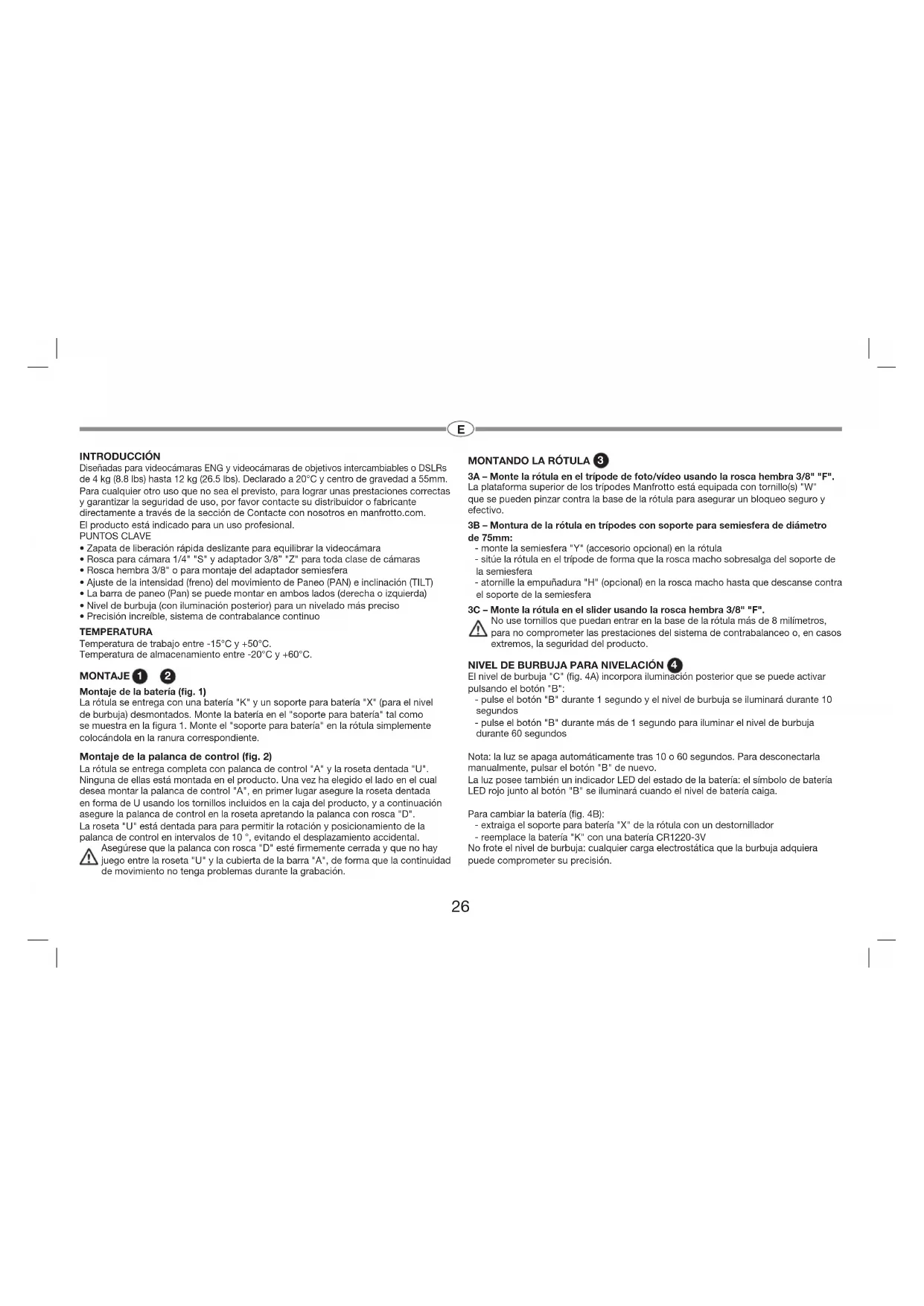 - Precisión increíble, sistema de contrabalance continuo TEMPERATURA Temperatura de trabajo entre -15°C y +50°C. Temperatura de almacenamiento entre -20°C y +60°C. MONTAJE Y Montaje de la batería (fig. 1) La rótula se entrega con una batería "K" y un soporte para batería "X" (para el nivel de burbuja) desmontados. Monte la batería en el "soporte para batería" tal como se muestra en la figura 1. Monte el "soporte para batería" en la rótula simplemente colocándola en la ranura correspondiente. Montaje de la palanca de control (fig. 2) La rótula se entrega completa con palanca de control "A" y la roseta dentada "U". Ninguna de ellas está montada en el producto. Una vez ha elegido el lado en el cual desea montar la palanca de control "A", en primer lugar asegure la roseta dentada en forma de U usando los tornillos incluidos en la caja del producto, y a continuación asegure la palanca de control en la roseta apretando la palanca con rosca "D". La roseta "U" está dentada para para permitir la rotación y posicionamiento de la palanca de control en intervalos de 10 °, evitando el desplazamiento accidental. Asegúrese que la palanca con rosca "D" esté firmemente cerrada y que no hay juego entre la roseta "U" y la cubierta de la barra "A", de forma que la continuidad de movimiento no tenga problemas durante la grabación.