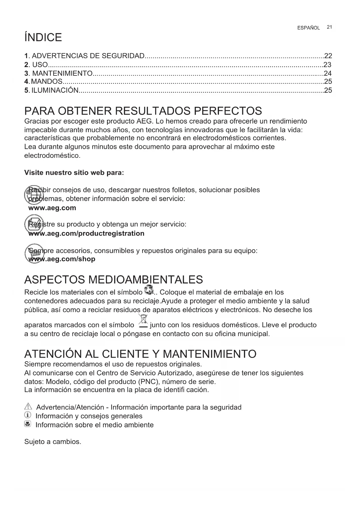 Siempre recomendamos el uso de repuestos originales. Al comunicarse con el Centro de Servicio Autorizado, asegúrese de tener los siguientes datos: Modelo, código del producto (PNC), número de serie. La información se encuentra en la placa de identifi cación. Advertencia/Atención - Información importante para la seguridad Información y consejos generales Información sobre el medio ambiente Sujeto a cambios.22 www.aeg.com