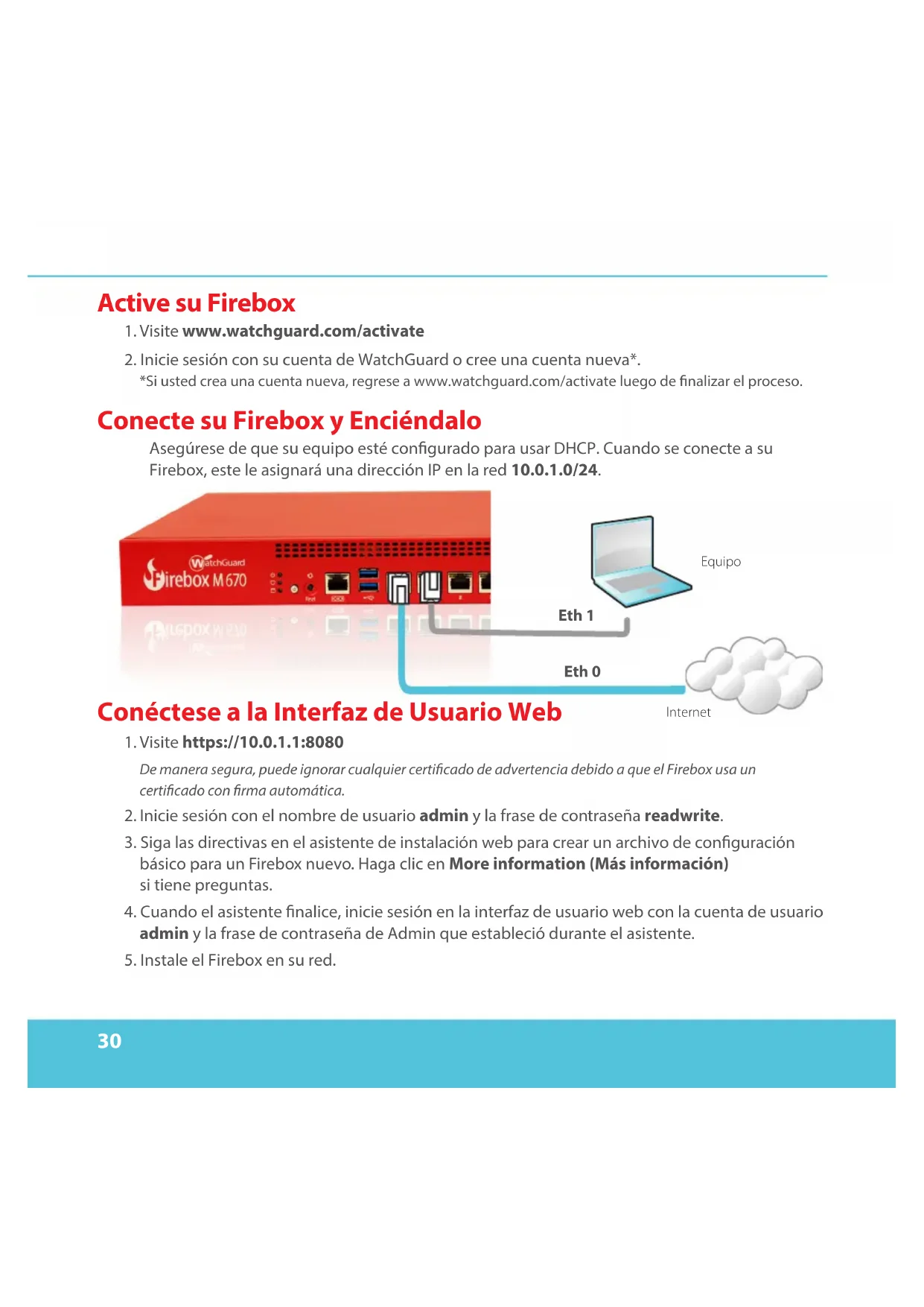 *Si usted crea una cuenta nueva, regrese a www.watchguard.com/activate luego de nalizar el proceso. Conecte su Firebox y Enciéndalo Asegúrese de que su equipo esté congurado para usar DHCP. Cuando se conecte a su Firebox, este le asignará una dirección IP en la red 10.0.1.0/24. Conéctese a la Interfaz de Usuario Web