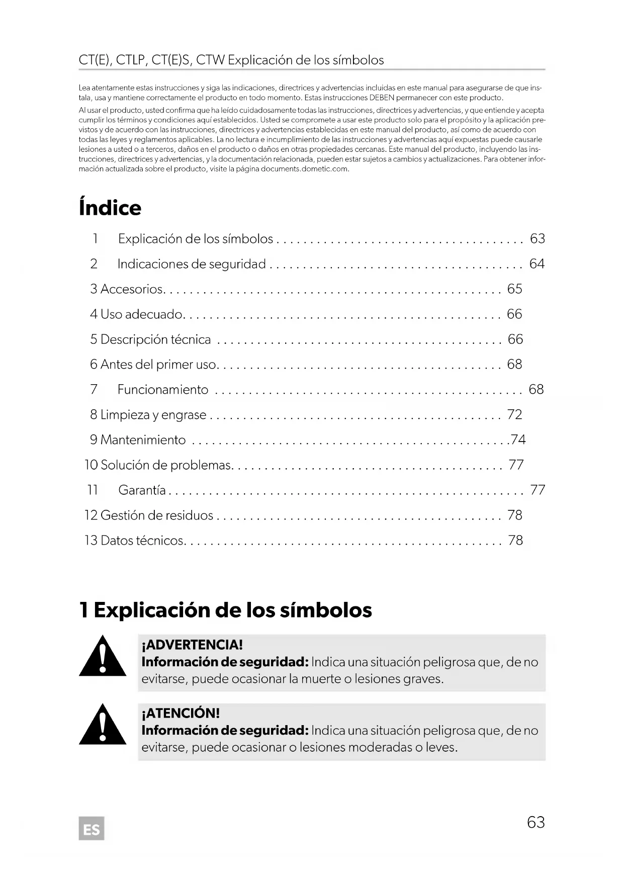 - Lea atentamente estas instrucciones y siga las indicaciones, directrices y advertencias incluidas en este manual para asegurarse de que ins- tala, usa y mantiene correctamente el producto en todo momento. Estas instrucciones DEBEN permanecer con este producto. Al usar el producto, usted confirma que ha leído cuidadosamente todas las instrucciones, directrices y advertencias, y que entiende y acepta cumplir los términos y condiciones aquí establecidos. Usted se compromete a usar este producto solo para el propósito y la aplicación pre- vistos y de acuerdo con las instrucciones, directrices y advertencias establecidas en este manual del producto, así como de acuerdo con todas las leyes y reglamentos aplicables. La no lectura e incumplimiento de las instrucciones y advertencias aquí expuestas puede causarle lesiones a usted o a terceros, daños en el producto o daños en otras propiedades cercanas. Este manual del producto, incluyendo las ins- trucciones, directrices y advertencias, y la documentación relacionada, pueden estar sujetos a cambios y actualizaciones. Para obtener infor- mación actualizada sobre el producto, visite la página documents.dometic.com. Índice 1 Explicación de los símbolos p. 63