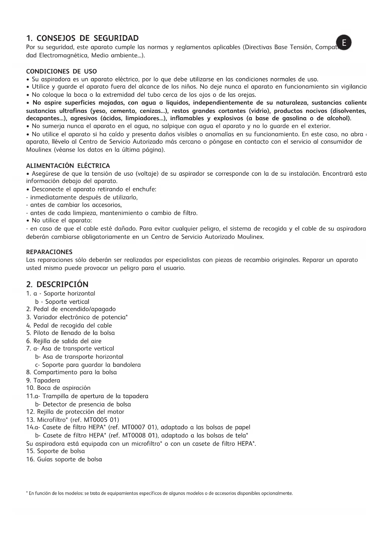 14.a- Casete de filtro HEPA* (ref. MT0007 01), adaptado a las bolsas de papel b- Casete de filtro HEPA* (ref. MT0008 01), adaptado a las bolsas de tela* Su aspiradora está equipada con un microfiltro* o con un casete de filtro HEPA*.