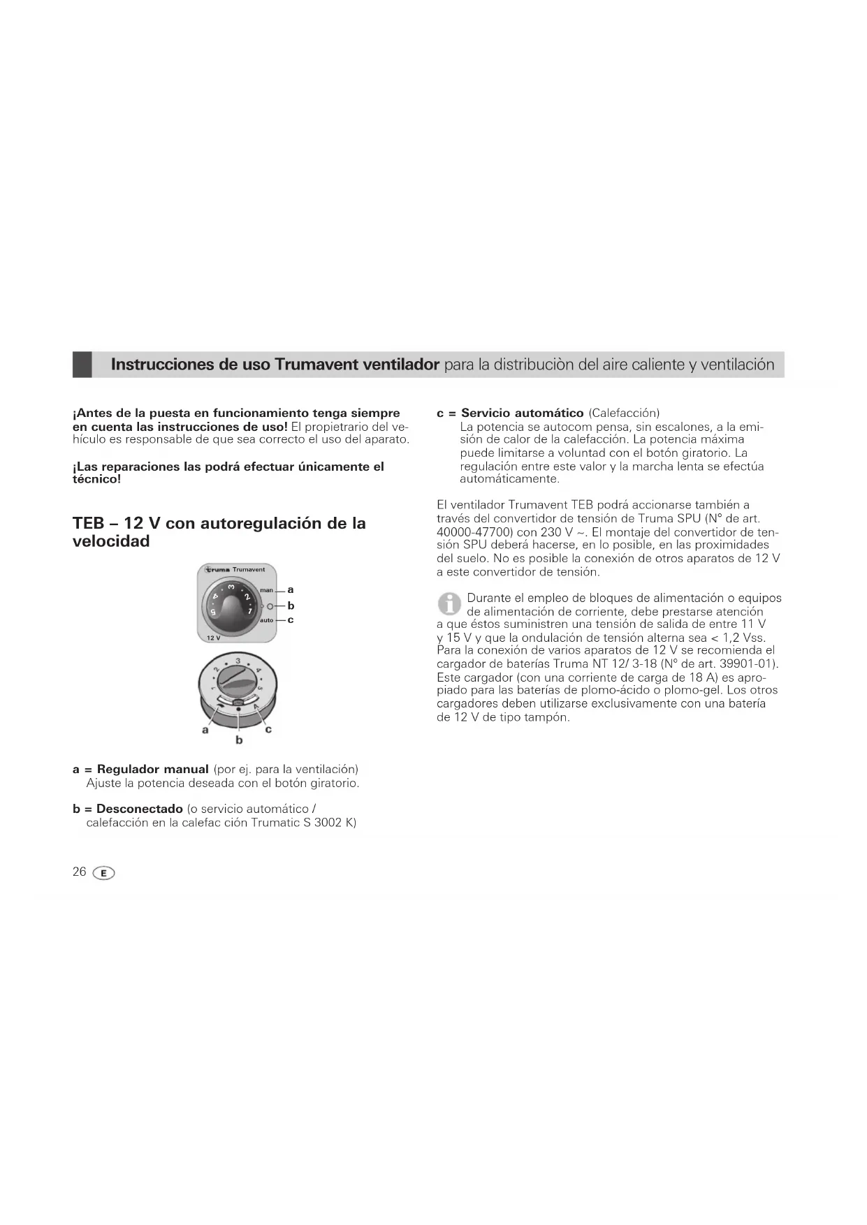a = Regulador manual (por ej. para la ventilación) Ajuste la potencia deseada con el botón giratorio. b = Desconectado (o servicio automático / calefacción en la calefac ción Trumatic S 3002 K) c = Servicio automático (Calefacción) La potencia se autocom pensa, sin escalones, a la emi- sión de calor de la calefacción. La potencia máxima puede limitarse a voluntad con el botón giratorio. La regulación entre este valor y la marcha lenta se efectúa automáticamente. El ventilador Trumavent TEB podrá accionarse también a través del convertidor de tensión de Truma SPU (N° de art. 40000-47700) con 230 V ~. El montaje del convertidor de ten- sión SPU deberá hacerse, en lo posible, en las proximidades del suelo. No es posible la conexión de otros aparatos de 12 V a este convertidor de tensión. Durante el empleo de bloques de alimentación o equipos de alimentación de corriente, debe prestarse atención a que éstos suministren una tensión de salida de entre 11 V y 15 V y que la ondulación de tensión alterna sea < 1,2 Vss. Para la conexión de varios aparatos de 12 V se recomienda el cargador de baterías Truma NT 12/ 3-18 (Nº de art. 39901-01). Este cargador (con una corriente de carga de 18 A) es apro- piado para las baterías de plomo-ácido o plomo-gel. Los otros cargadores deben utilizarse exclusivamente con una batería de 12 V de tipo tampón. Instrucciones de uso Trumavent ventilador para la distribuciòn del aire caliente y ventilación27 TN – 230 V Modelo estándar