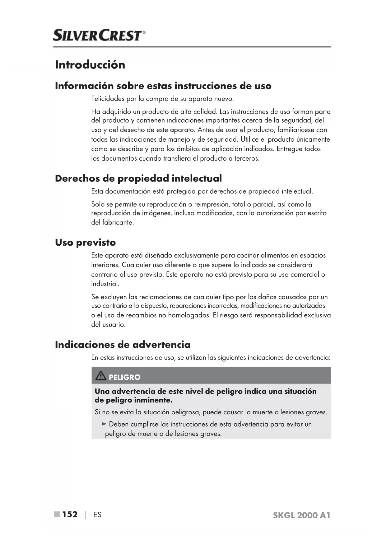 ES Introducción Información sobre estas instrucciones de uso Felicidades por la compra de su aparato nuevo. Ha adquirido un producto de alta calidad. Las instrucciones de uso forman parte del producto y contienen indicaciones importantes acerca de la seguridad, del uso y del desecho de este aparato. Antes de usar el producto, familiarícese con todas las indicaciones de manejo y de seguridad. Utilice el producto únicamente como se describe y para los ámbitos de aplicación indicados. Entregue todos los documentos cuando transfiera el producto a terceros. Derechos de propiedad intelectual Esta documentación está protegida por derechos de propiedad intelectual. Solo se permite su reproducción o reimpresión, total o parcial, así como la reproducción de imágenes, incluso modificadas, con la autorización por escrito del fabricante. Uso previsto Este aparato está diseñado exclusivamente para cocinar alimentos en espacios interiores. Cualquier uso diferente o que supere lo indicado se considerará contrario al uso previsto. Este aparato no está previsto para su uso comercial o industrial. Se excluyen las reclamaciones de cualquier tipo por los daños causados por un uso contrario a lo dispuesto, reparaciones incorrectas, modificaciones no autorizadas o el uso de recambios no homologados. El riesgo será responsabilidad exclusiva del usuario. Indicaciones de advertencia En estas instrucciones de uso, se utilizan las siguientes indicaciones de advertencia: PELIGRO Una advertencia de este nivel de peligro indica una situación de peligro inminente. Si no se evita la situación peligrosa, puede causar la muerte o lesiones graves. ► Deben cumplirse las instrucciones de esta advertencia para evitar un peligro de muerte o de lesiones graves.SKGL 2000 A1 ES