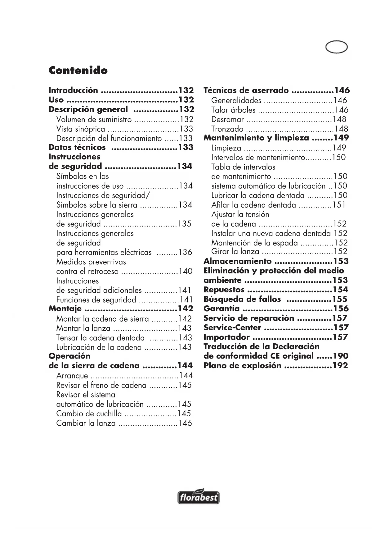Freno de la cadena enclavado Revisar el freno de la cadena, si es necesario soltarla No hay tensión en la red eléctrica Fusible de la casa reacciona Revisar tomacorriente, cable, con- ductor, enchufe, eventualmente reparación por electricista. Revisar fusible, véase Nota Interruptor de arranque/ parada (10) defectuoso Reparación por servicio técnico Escobillas de carbón desgas- tadas Reparación por servicio técnico Motor defectuoso Reparación por servicio técnico Cadena no gira Freno de cadena bloquea ca- dena dentada (5) Revisar freno de cadena, eventual- mente desaplicar freno de cadena Bajo rendimiento de corte Cadena dentada (5) montada incorrectamente Montar cadena dentada correcta- mente Cadena dentada (5) desalada Alar dientes cortantes o instalar nueva cadena Tensión de cadena insuciente Revisar tensión de cadena Sierra con marcha dicultosa, cade- na se sale Tensión de cadena insuciente Revisar tensión de cadena Cadena se calien- ta, desarrollo de humo al aserrar, cambio de color del riel Falta aceite para lubricar la cadena Revisar nivel de aceite y agregar aceite si fuese necesario, revisar sistema automático de lubricación y limpiar canal de salida de aceite o reparación por servicio técnico Controlar la regulación de preci- sión de aceite (botón regulador de aceite)1 5 6 E S Garantía Estimada clienta, estimado cliente: Por este aparato se le concede una garantía de 3 años a partir de la fecha de compra. En caso de defectos de este producto, le corresponden derechos legales contra el vendedor del producto. Estos derechos no serán limitados por la garantía expuesta a continuación. Condiciones de garantía El plazo de garantía empieza con la fecha de compra. Por favor, conserve bien el res- guardo de caja original. Este documento se necesitará como prueba de la compra. Si dentro del plazo de tres años después de la fecha de compra del aparato se de- tecta un defecto de material o fabricación, según nuestra elección, el producto será reparado o sustituido gratuitamente. Esta prestación de garantía presupone entregar el aparato defectuoso y el comprobante de compra (resguardo de caja) dentro del plazo de los tres años, describiendo brevemente por escrito en qué consiste el defecto y cuándo se detectó. Si el defecto está cubierto por nuestra garantía, le devolveremos el aparato re- parado o uno nuevo. Con la reparación o la sustitución del producto no se inicia un nuevo período de garantía. Período de garantía y exigencias legales en caso de defectos El período de garantía no será prolonga- do por la prestación de garantía. Esto se aplica igualmente a las partes sustituidas y reparadas. Daños y defectos ya existen- tes eventualmente al comprar el aparato, tienen que ser noticados inmediatamente después de haberlo desempacado. Las re- paraciones a efectuar al cabo del período de garantía están sujetas a pago. Volumen de la garantía El aparato fue producido cuidadosamente según las directivas estrictas de la calidad y examinado concienzudamente antes de la entrega. La prestación de garantía tiene validez para defectos de material o fabricación. Esta garantía no se extiende a partes del producto que están sometidas a un des- gaste natural y, por lo tanto, pueden ser consideradas como piezas de desgaste (p. ej. cadena dentada), o a daños en partes frágiles (p. ej. interruptores). Esta garantía caduca si el producto fue dañado, utilizado impropiamente o no sometido a mantenimiento. Para un uso apropiado del producto, se han de cum- plir exactamente todas las indicaciones contenidas en las instrucciones de manejo. Se tienen que evitar absolutamente nes de aplicación y manejos, de los cuales desaconsejan o advierten las instrucciones de servicio. El producto está previsto solamente para el uso privado y no comercial. La garantía caducará en el caso de un tratamiento abusivo e impropio, uso de la fuerza o ma- nipulaciones que no fueron efectuadas por una lial de servicio autorizada. Gestión en caso de garantía Para garantizar una gestión rápida de su reclamación, le rogamos seguir las siguien- tes indicaciones: