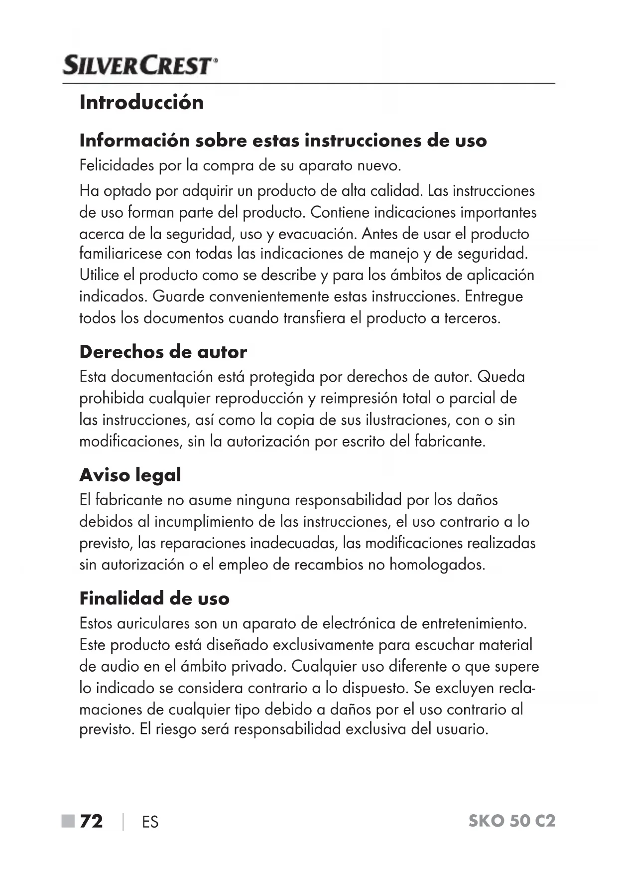 ES Introducción Información sobre estas instrucciones de uso Felicidades por la compra de su aparato nuevo. Ha optado por adquirir un producto de alta calidad. Las instrucciones de uso forman parte del producto. Contiene indicaciones importantes acerca de la seguridad, uso y evacuación. Antes de usar el producto familiaricese con todas las indicaciones de manejo y de seguridad. Utilice el producto como se describe y para los ámbitos de aplicación indicados. Guarde convenientemente estas instrucciones. Entregue todos los documentos cuando transfiera el producto a terceros. Derechos de autor Esta documentación está protegida por derechos de autor. Queda prohibida cualquier reproducción y reimpresión total o parcial de las instrucciones, así como la copia de sus ilustraciones, con o sin modificaciones, sin la autorización por escrito del fabricante. Aviso legal El fabricante no asume ninguna responsabilidad por los daños debidos al incumplimiento de las instrucciones, el uso contrario a lo previsto, las reparaciones inadecuadas, las modificaciones realizadas sin autorización o el empleo de recambios no homologados. Finalidad de uso Estos auriculares son un aparato de electrónica de entretenimiento. Este producto está diseñado exclusivamente para escuchar material de audio en el ámbito privado. Cualquier uso diferente o que supere lo indicado se considera contrario a lo dispuesto. Se excluyen recla- maciones de cualquier tipo debido a daños por el uso contrario al previsto. El riesgo será responsabilidad exclusiva del usuario.SKO 50 C2 ES