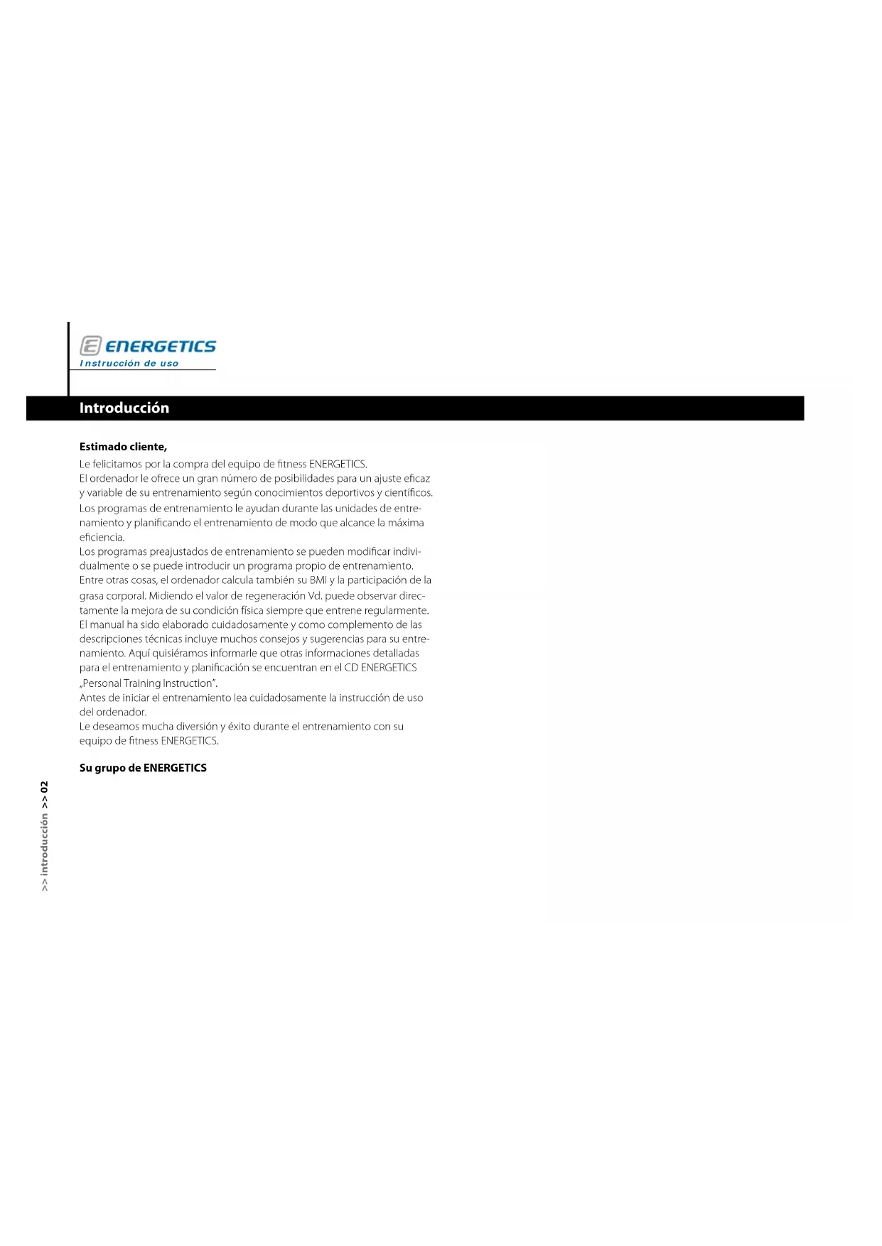 - Omduärtorromhänderna,prövaattfuktahandflatornalättmedvatten. Datorn stängs ned I sällsynta fall kan datorn stängas ned, oftast pga ett plötsligt spänningsfall eller statisk laddning. Normalt återstartar E-203 automatiskt. Om inte, dra ur elsladden, vänta några sekunder och sätt i sladden igen. Skötsel Skydda datorn mot fukt. Rengör med en mjuk rengöringsduk fuktad med vatten. Starka (kemiska) rengöringsmedel får inte användas. Underhåll Din träningsdator kräver inget särskilt underhåll. Kontrollera dock regelbun- det att alla skruvar och anslutningar sitter fast. Byt ev. slitna eller skadade delar snarast. För information, råd och hjälp, kontakta din ENERGETICS-butik.ES Indice Introducción ............................................................02 Explicación de marcas ...................................................03 Pantalla y sus indicadores ..........................................04 Buje ...............................................................04 Montaje y activación .....................................................05 Conexión del ordenador . . . . . . . . . . . . . . . . . . . . . . . . . . . . . . . . . . . . . . . . . . . 05 Activación del ordenador ..........................................05 Inicio, control, tono de señal .......................................05 Régimen de calma ................................................05 Activación rápida ........................................................06 Valores básicos y ajuste básico ...........................................07 Programas de entrenamiento – función y ajuste .........................08 Qué es programa de entrenamiento ...............................08 Ajuste individual/parámetros del entrenamiento ..................08 Uso de programas de entrenamiento ..............................10 Informaciones generales de programas ............................14 Específicos de los indicadores en al pantalla durante el entrenamiento ....................................................14 Selección y ajuste de programas .........................................15 Programas individuales ............................................15 Programa manual (P 1) .....................................15 Programa del usuario (P 7) ..................................17 Programas preajustados (P 2 – 6) ..................................19 Circuito (P 2) . . . . . . . . . . . . . . . . . . . . . . . . . . . . . . . . . . . . . . . . . . . . . . . . 20 Intervalo (P 3) ...............................................20 Estrecho (P 4) ...............................................21 Loma (P 5) ..................................................21 Paso (P 6) ...................................................21 BMI-medición de la grasa corporal (P 8) ............................21 Programa de regeneración ........................................24 Pausa/interrupción de entrenamiento y Reset .....................24 Seguridad .........................................................24 Preguntas frecuentes ....................................................25 Servicio ..................................................................26 Búsqueda de fallos ................................................26 Cuidado ...........................................................26 Mantenimiento ...................................................26 >> índice >> 01 Instrucción de uso de E-203Instrucción de uso >> introducción >> 02 Introducción Estimado cliente, Le felicitamos por la compra del equipo de fitness ENERGETICS. El ordenador le ofrece un gran número de posibilidades para un ajuste eficaz y variable de su entrenamiento según conocimientos deportivos y científicos. Los programas de entrenamiento le ayudan durante las unidades de entre- namiento y planificando el entrenamiento de modo que alcance la máxima eficiencia. Los programas preajustados de entrenamiento se pueden modificar indivi- dualmente o se puede introducir un programa propio de entrenamiento. Entre otras cosas, el ordenador calcula también su BMI y la participación de la grasa corporal. Midiendo el valor de regeneración Vd. puede observar direc- tamente la mejora de su condición física siempre que entrene regularmente. El manual ha sido elaborado cuidadosamente y como complemento de las descripciones técnicas incluye muchos consejos y sugerencias para su entre- namiento. Aquí quisiéramos informarle que otras informaciones detalladas para el entrenamiento y planificación se encuentran en el CD ENERGETICS „Personal Training Instruction”. Antes de iniciar el entrenamiento lea cuidadosamente la instrucción de uso del ordenador. Le deseamos mucha diversión y éxito durante el entrenamiento con su equipo de fitness ENERGETICS. Su grupo de ENERGETICSES >> explicación de marcas >> 03 Explicación de marcas Botón para aumentar valores Botón para reducir valores Pulse el botón de regeneración Pulse el botón Start-Stop Pulse el botón Set Ponga las manos en los detectores del pulso manual Programa 1 (individual) – Manual Programa 2 (ajustable) – Circuito PPrograma 3 (ajustable) – Intervalo Programa 4 ajustable) – Estrecho Programa 5 (ajustable) – Loma Programa 6 (ajustable) – Paso Programa 7 (individual) – Usuario Programa 8 (función de medición) – BMI-grasa corporalInstrucción de uso >> explicación de marcas >> 04 Pantalla y sus indicadores (D1)SCAN – funciones de la medición están activas (D2) FAT % – porcentaje de la grasa corporal (%) (D3) PROGRAM – programa de entrenamiento está activo o posibilidad de selección (D4) BMI – Body Mass Index (D5) Sexo – femenino (D6) Sexo – masculino (D7) AGE – edad (D8) HEIGHT – altura corporal (cm) (D9) WEIGHT – peso corporal (kg) (D10) P –stop, programa está interrumpido o no se está realizando actividad alguna (D11) programa 8 – BMI-medición de la grasa corporal (función de la medición) (D12) programa ind