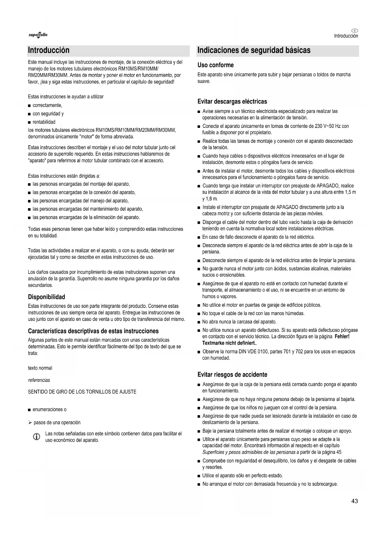 Este manual incluye las instrucciones de montaje, de la conexión electrica y del manejo de los motores tubulares electrónicos RM10MS/RM10MM/ RM20MM/RM30MM. Anteles de montar y poder el motor en funciona bajo, por favor, jea y siga estas instrucciones, en particular el capitulo de seguridad!