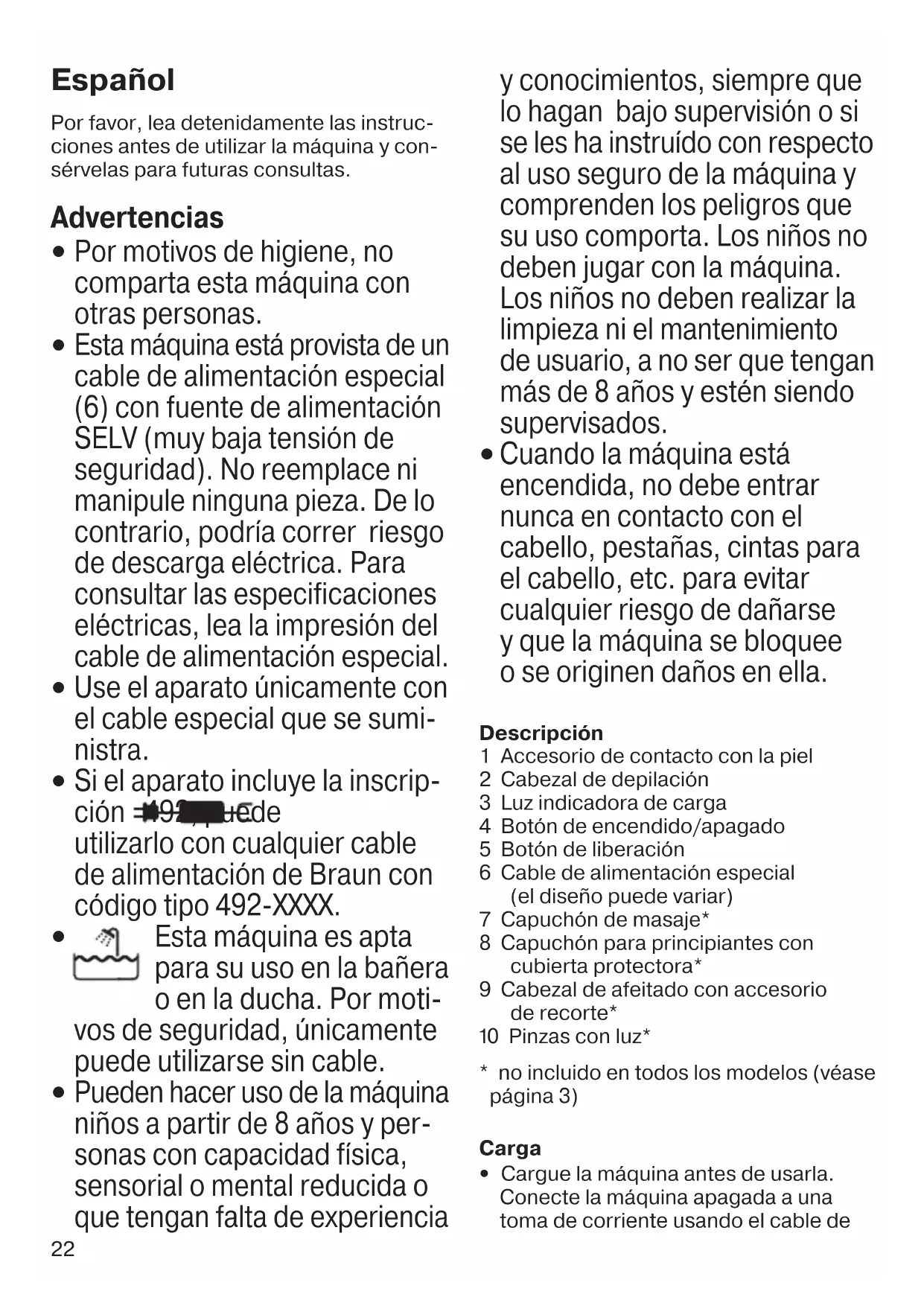 Cuando la máquina está encendida, no debe entrar nunca en contacto con el cabello, pestañas, cintas para el cabello, etc. para evitar cualquier riesgo de dañarse y que la máquina se bloquee o se originen daños en ella. Descripción 1 Accesorio de contacto con la piel 2 Cabezal de depilación 3 Luz indicadora de carga 4 Botón de encendido/apagado 5 Botón de liberación 6 Cable de alimentación especial (el diseño puede variar) 7 Capuchón de masaje* 8 Capuchón para principiantes con cubierta protectora* 9 Cabezal de afeitado con accesorio de recorte* 0 Pinzas con luz*