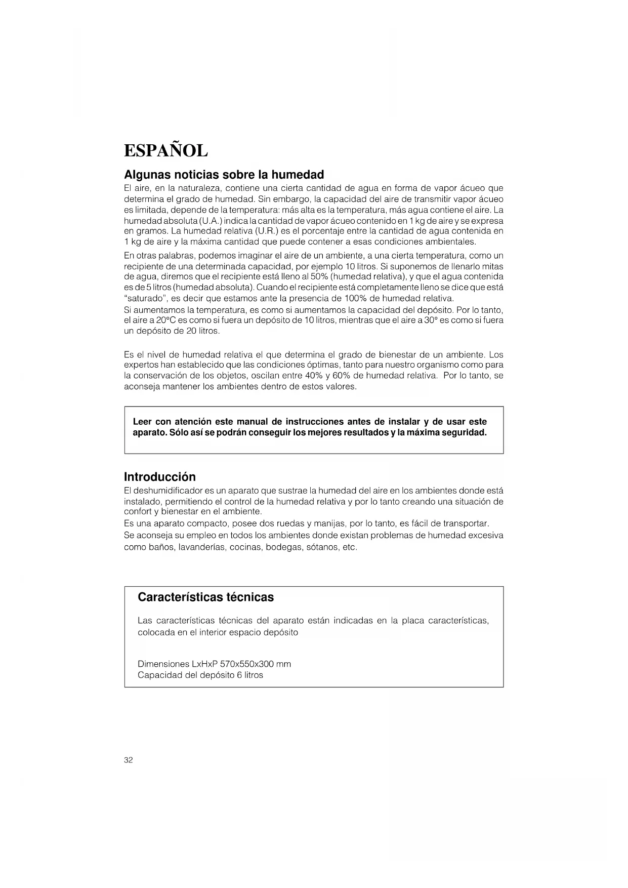 - Het is normaal onder bepaalde omstandigheden dat het apparaat niet ontvochtigd.32 Introducción El deshumidificador es un aparato que sustrae la humedad del aire en los ambientes donde está instalado, permitiendo el control de la humedad relativa y por lo tanto creando una situación de confort y bienestar en el ambiente. Es una aparato compacto, posee dos ruedas y manijas, por lo tanto, es fácil de transportar. Se aconseja su empleo en todos los ambientes donde existan problemas de humedad excesiva como baños, lavanderías, cocinas, bodegas, sótanos, etc. Características técnicas Las características técnicas del aparato están indicadas en la placa características, colocada en el interior espacio depósito Dimensiones LxHxP 570x550x300 mm Capacidad del depósito 6 litros ESPAÑOL Leer con atención este manual de instrucciones antes de instalar y de usar este aparato. Sólo así se podrán conseguir los mejores resultados y la máxima seguridad. Algunas noticias sobre la humedad El aire, en la naturaleza, contiene una cierta cantidad de agua en forma de vapor ácueo que determina el grado de humedad. Sin embargo, la capacidad del aire de transmitir vapor ácueo es limitada, depende de la temperatura: más alta es la temperatura, más agua contiene el aire. La humedad absoluta (U.A.) indica la cantidad de vapor ácueo contenido en 1 kg de aire y se expresa en gramos. La humedad relativa (U.R.) es el porcentaje entre la cantidad de agua contenida en 1 kg de aire y la máxima cantidad que puede contener a esas condiciones ambientales. En otras palabras, podemos imaginar el aire de un ambiente, a una cierta temperatura, como un recipiente de una determinada capacidad, por ejemplo 10 litros. Si suponemos de llenarlo mitas de agua, diremos que el recipiente está lleno al 50% (humedad relativa), y que el agua contenida es de 5 litros (humedad absoluta). Cuando el recipiente está completamente lleno se dice que está “saturado”, es decir que estamos ante la presencia de 100% de humedad relativa. Si aumentamos la temperatura, es como si aumentamos la capacidad del depósito. Por lo tanto, el aire a 20°C es como si fuera un depósito de 10 litros, mientras que el aire a 30° es como si fuera un depósito de 20 litros. Es el nivel de humedad relativa el que determina el grado de bienestar de un ambiente. Los expertos han establecido que las condiciones óptimas, tanto para nuestro organismo como para la conservación de los objetos, oscilan entre 40% y 60% de humedad relativa. Por lo tanto, se aconseja mantener los ambientes dentro de estos valores.33 tubo de desagüe condensación 1 (2 m.)