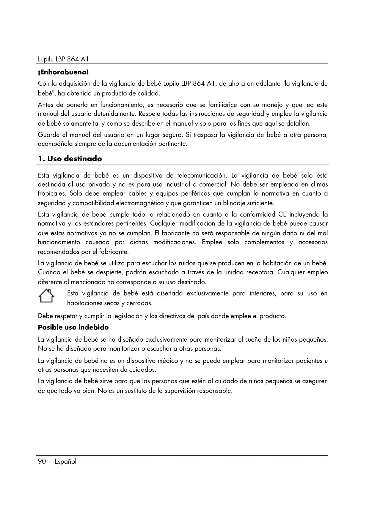 Esta vigilancia de bebé es un dispositivo de telecomunicación. La vigilancia de bebé solo está destinada al uso privado y no es para uso industrial o comercial. No debe ser empleada en climas tropicales. Solo debe emplear cables y equipos periféricos que cumplan la normativa en cuanto a seguridad y compatibilidad electromagnética y que garanticen un blindaje suficiente. Esta vigilancia de bebé cumple todo lo relacionado en cuanto a la conformidad CE incluyendo la normativa y los estándares pertinentes. Cualquier modificación de la vigilancia de bebé puede causar que estas normativas ya no se cumplan. El fabricante no será responsable de ningún daño ni del mal funcionamiento causado por dichas modificaciones. Emplee solo complementos y accesorios recomendados por el fabricante. La vigilancia de bebé se utiliza para escuchar los ruidos que se producen en la habitación de un bebé. Cuando el bebé se despierte, podrán escucharlo a través de la unidad receptora. Cualquier empleo diferente al mencionado no corresponde a su uso destinado. Esta vigilancia de bebé está diseñada exclusivamente para interiores, para su uso en habitaciones secas y cerradas. Debe respetar y cumplir la legislación y las directivas del país donde emplee el producto. Posible uso indebido La vigilancia de bebé se ha diseñado exclusivamente para monitorizar el sueño de los niños pequeños. No se ha diseñado para monitorizar o escuchar a otras personas. La vigilancia de bebé no es un dispositivo médico y no se puede emplear para monitorizar pacientes u otras personas que necesiten de cuidados. La vigilancia de bebé sirve para que las personas que estén al cuidado de niños pequeños se aseguren de que todo va bien. No es un sustituto de la supervisión responsable.Lupilu LBP 864 A1 Español - 91