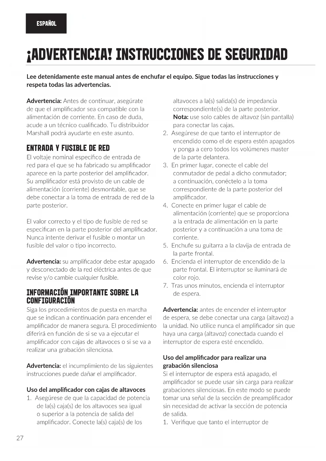 Advertencia: Antes de connuar, asegúrate de que el amplicador sea compable con la alimentación de corriente. En caso de duda, acude a un técnico cualicado. Tu distribuidor Marshall podrá ayudarte en este asunto.