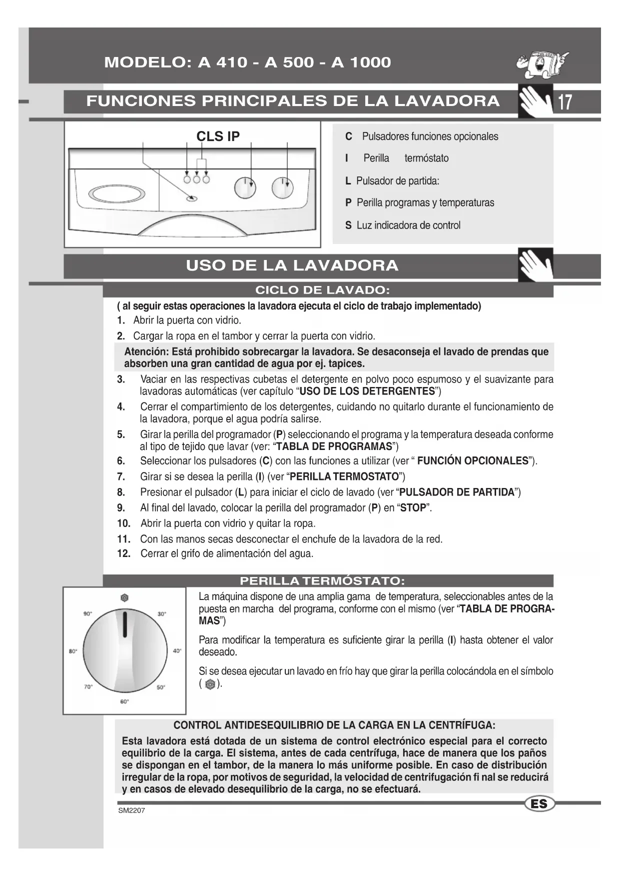 STOP LUZ INDICADORA DE CONTROL: La luz indicadora está apagada cuando la perilla del programador está en la posición de STOP. La luz indicadora está constantemente encendida durante la ejecución del programa. La luz indicadora parpadea lentamente una vez que el programa ha terminado.“STOP” EN EL PROGRAMADOR: FUNCIONES OPCIONALES Al presionar este pulsador, se obtiene un lavado corto con una temperatura máxima de 40°C por una duración de 10 minutos aproximadamente. Dicha función puede usarse sólo en los programas “ALGODÓN”,”SINTÉTICOS” y ”DAILY”. N.B. Si utiliza esta opción, el detergente debe vaciarse también en la cubeta específi ca para el prelavado.PRELAVADO:La función de stop es la de reconfi gurar la lavadora. Si por cualquier motivo durante un ciclo de lavado se desea variarlo, o se decidiera en un segundo momento agregar otra ropa al interior de la máquina, basta simplemente posicionar la perilla del programador en la posición de “STOP”, luego reimplantar la perilla en el nuevo programa deseado y presionar el pulsador “START”.¡¡Atención!! Se aconseja utilizar esta función sólo si estrictamente necesario y solamente si el programa a reconfi gurar ha iniciado hace no más de 3 minutos. Antes de poder abrir la puerta con vidrio después de una reconfi guración, hay que esperar 2 minutos para su desbloqueo.Presionando este pulsador la lavadora inicia el ciclo de lavado.EXCLUSIÓN CENTRÍFUGA:Al presionar esta función la máquina efectúa un ciclo de lavado excluyendo la centrí-fuga.N. B. El uso de las funciones opcionales están vinculadas al tipo de programa seleccionado, por lo cual si la función no está admitida por el programa no será posible habilitar el pulsador (ver TABLA PROGRAMAS). PULSADOR DE PARTIDA:19 SM2207