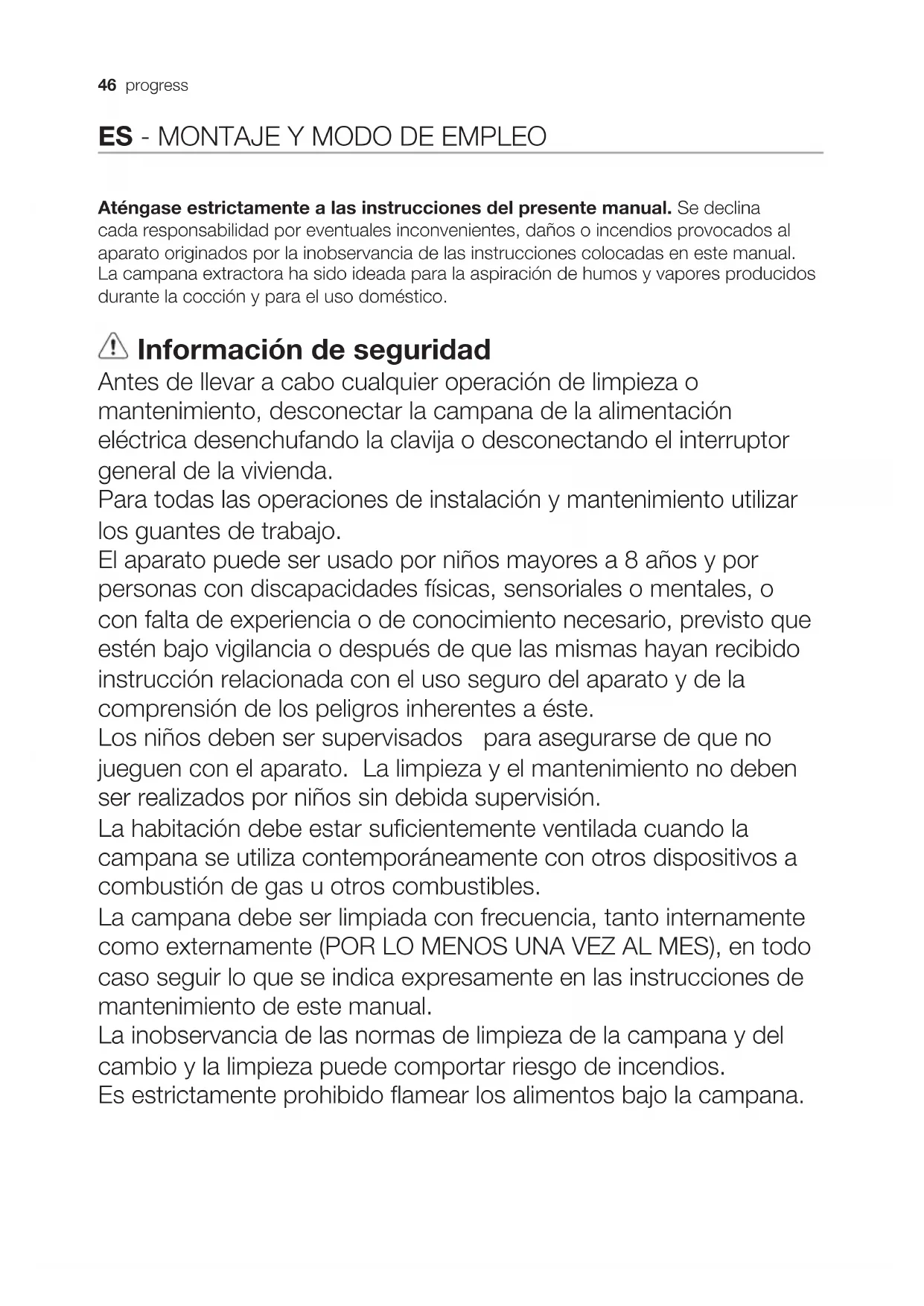 Instalación La tensión de red debe corresponder con tensión indicada en la etiqueta colocada en el interior de la campana.Si es suministrada con un enchufe, conectar la campana a un enchufe conforme a las normas en vigor y colocarlo en una zona accesible, aun después de la instalación. Si no es suministrada con enchufe (conexión directa a la red) o clavija y no es posible situarla en un lugar accesible, aun después de la instalación, colocar un interruptor bipolar de acuerdo con las normativas, para asegurarse la desconexión completa a la red en el caso de la categoria de alta tensión III, conforme con las reglas de instalación. Antes de reconectar el circuito de la campana a la red y de verificar el correcto funcionamiento, controlar siempre que el cable de red fue montado correctamente.48 progress La distancia mínima entre la superficie de cocción y la parte más baja de la campana no debe ser inferior a 50cm en el caso de cocinas electricas y de 65cm en el caso de cocinas a gas o mixtas. Si las instrucciones para la instalación del dispositivo para cocinar con gas especifican una distancia mayor, hay que tenerlo en consideración. Mantenimiento ¡Atención! Antes de cualquier operación de limpieza o mantenimiento, retire la campana de la red eléctrica desconectando el enchufe o desconectando el interruptor general de la casa. La campana debe ser limpiada con frecuencia tanto externamente como internamente (con la misma frecuencia con la que se realiza el mantenimiento de los filtros de grasa). Para la limpieza, utilice un paño impregnado de detergente líquido neutro. No utilice productos que contengan abrasivos. ¡NO UTILICE ALCOHOL! ¡Atención! De no observarse las instrucciones dadas para limpiar el aparato y sustituir el filtro, puede producirse un incendio. El fabricante recomienda leerlas y respetarlas atentamente. El fabricante no se hace responsable por los daños al motor o los incendios provocados en el aparato debido a intervenciones de mantenimiento incorrectas o al incumplimiento de las normas de seguridad proporcionadas. Filtro antigrasa - El filtro antigrasa debe limpiarse una vez al mes con detergentes no agresivos, manualmente o bien en lavavajillas a bajas temperaturas y con ciclo breve. Con el lavado en el lavavajilla el filtro antigrasa metálico puede desteñirse pero sus características de filtrado no cambian absolutamente. Filtro al carbón activo - Type 20 LONG LIFE - Filtro al carbón activo lavable El filtro al carbón puede lavarse cada dos meses con agua caliente y detergentes adecuados o en lavavajillas a 65°C ( en caso de lavado con lavavajillas, realice el ciclo de lavado completo sin platos en el interior.). Quite el agua que haya quedado en el filtro sin estropearlo, después quite el almohadillado situado en el interior del armazón de plástico y póngalo en el horno a 100°C durante diez minutos para secarlo completamente. Cambie el almohadillado cada 3 años y cada vez que el paño se estropee. Type 15 - Filtro al carbón activo NO lavable La saturaciòn del carbòn activado ocurre despuès da mas o menos tiempo de uso prolongado, dependiendo del tipo de cocina y de la regularidad de limpieza del filtro de grasa. En cualquier caso es necesario sustituir el cartucho al menos cada 4 meses. NO puede lavarse o reciclarse.