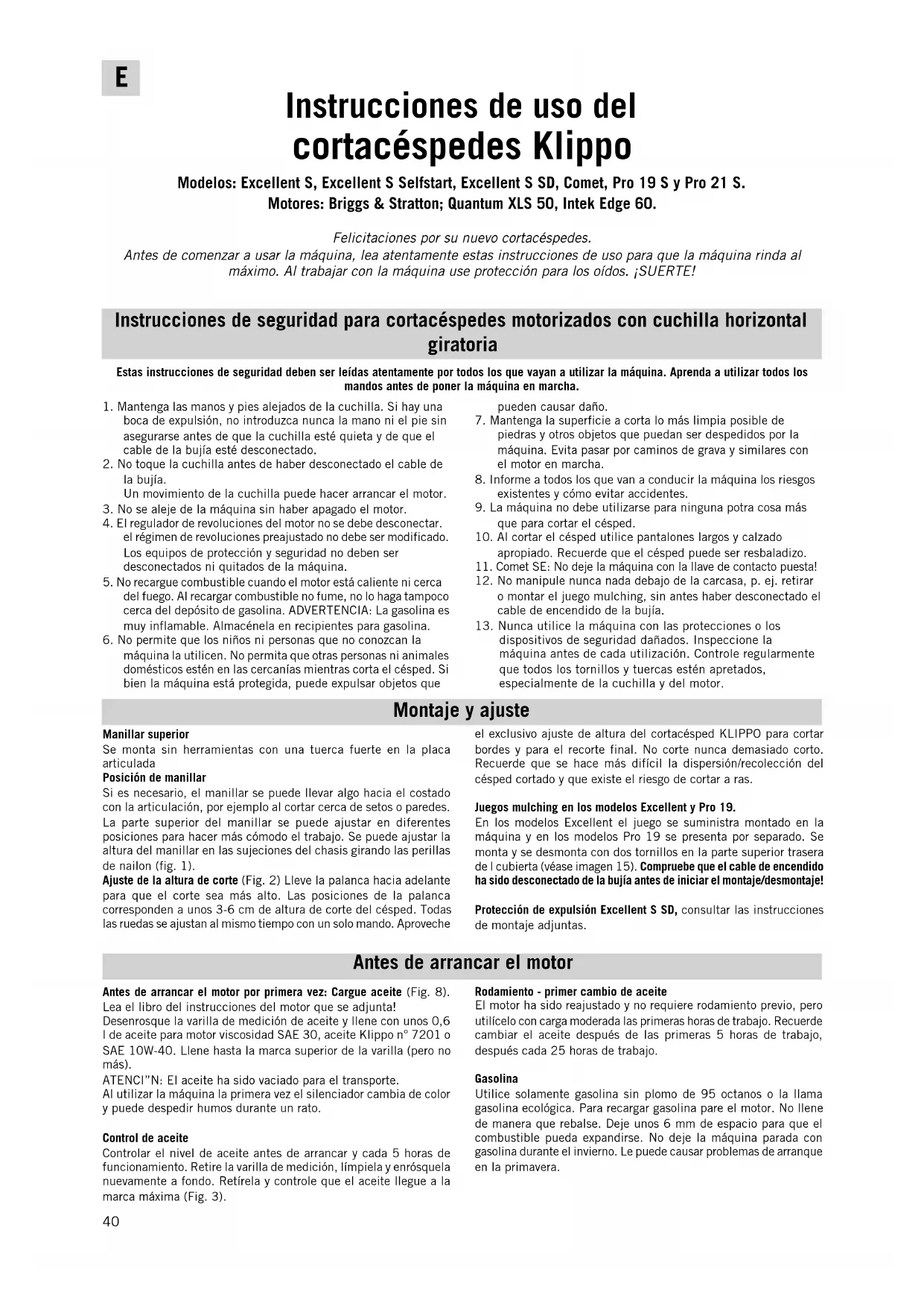 Excellent Selfstart: Para realizar el servicio y mantenimiento desconecte el cable de la bujía, haga un arranque normal para liberar el muelle de arranque y retire la llave naranja. Comet SE Al arrancar por primera vez la batería puede tener poca carga. En Limpie el césped antes de cortar. Los objetos duros son peligrosos y además la cuchilla se estropea. Un cortacésped motorizado no se debe chocar contra objetos fijos, controle y marque los tubos que no se vean, etc. Conduzca la máquina con tranquilidad y en forma metódica, por ejemplo en círculos. Siempre de manera que se bor- ren las líneas cortadas. Preferentemente debe cortar en diferentes direcciones cada vez. Consejos para cortar el césped Los expertos coinciden en que siempre es mejor cortar una tercera parte de la longitud del césped por vez. Se estimula así el crecimiento y todo el césped será más fuerte y verde. Controle que las cuchillas estén en buen estado. Si las cuchillas están embotadas Para comenzar, desconecte el cable de la bujía antes de cualquier otra cosa. Para limpiar el interior de la cubierta, cambiar la cuchilla, etc. lo mejor es colocar el cortacésped sobre la parte trasera hacia abajo. El depósito de combustible no debe estar más que hasta la mitad, de lo contrario puede salir el combustible por la ventilación del depósito. Asegure el cortacésped en esta posición antes de comenzar a limpiar o cambiar la cuchilla. Si se procede de esta manera, se puede estar seguro que no habrá fugas de combustible ni aceite y que el aceite no se derramará sobre la bujía, el filtro de aire ni ningún otro lugar donde produzca problemas de funciona- miento ni de arranque. Instrucciones de cuidado Después de cada temporada, la máquina debe ser llevada a un taller de servicio autorizado KLIPPO. Las máquinas con catalizador deben ser llevada para control a un taller de servicio autorizado KLIPPO cada tres años o 100 horas de servicio, lo que ocurra primero. Mantenga la máquina limpia tanto sobre la cubierta como debajo de ésta. Al trabajar en la parte inferior, coloque la máquina con la bujía hacia arriba. Quite el césped inmediatamente antes de que se seque. Apriete todos los tornillos de sujeción de vez en cuando. Lubrique los fiadores y ejes después de cada temporada. Repase las partes brillantes con un paño embebido en aceite anticorrosivo. SI la máquina se usa profesionalmente se recomienda un servicio de rutina cada 50 horas de servicio. Utilice solamente repuestos originales y accesorios KLIPPO. (Requisitos para que sea válida la marca CE). Excellent Selfstart: Para realizar el servicio y mantenimiento desconecte el cable de la bujía, haga un arranque normal para liberar el muelle de arranque y retire la llve naranja. Sistema de cuchillas Fig. 6: Plato de cuchillas con 4 lengüetas inferiores de corte postizas y dos cuchillas superiores de corte postizas para los modelos Comet. Mulcher lam por a los modelos Excellent, Pro 19 y Pro 21. Cambio de cuchillas: Cuchillas fijas/plato de cuchillas Utilice la máquina hasta que se acabe la gasolina, quite el cable tal caso utilice la cuerda de arranque del motor y recargue la bate- ríacon la unidad de recarga adjunta. Consulte la sección “Mantenimiento, recarga de la batería”. Arranque eléctrico (antes del primer arranque, conectar el cable de la batería, ver la figura 13) Siga las instrucciones de arranque de los puntos 1 y 2 anteriores y gire luego la llave de arranque en sentido horario (Fig. 12). Mantenga la llave girada hasta que el motor arranque. Parada Los modelos Comet se para soltando la palanca de seguridad (figura 5b) entonces se para el motor y la propulsión se desconecta o llevando el mando de marcha hacia el stopp (Fig. 5c) es decir hacia atrás y arriba. De esta manera el motor estará funcionando peor la propulsión ha sido desconectada. Para conectar nuevamente la propulsión, llevar la palanca hacia adelante y abajo. Modelos Excellent, Pro 19 y Pro 21: Se paran soltando la palanca de seguridad (Fig. 5b). Si uno sólo quiere detener el avance mante- niendo el motor en marcha, se debe soltar la palanca de seguridad sólo un poco. Para acoplar nuevamente la propulsión se lleva el mando hacia adelante (Fig. 5c). Generalidades Mantenimiento el corte será desparejo y el césped se pondrá amarillo justamente en el corte. Corte con frecuencia. Un césped fino debe cortarse dos veces a la semana. No corte nunca cuando el césped esté mojado por la lluvia o húmedo por el rocío, se dificulta la dispersión y en los modelos que recogen se corre el riesgo de que se tapone el canal de salida. Ventajas de la propulsión delantera Toda la máquina se maniobra con más facilidad, se puede doblar, ir hacia atrás, cortar con facilidad al lado de árboles, etc. Sólo debe presionar el manillar y dejar que la rueda tractora gire en el aire. También se puede cortar con la propulsión delantera desconectada. de la bujía y levante la máquina con la bujía hacia arriba. Limpie el orificio “ojo de cerradura” de las cuchillas y quite los restos de césped. Por el “ojo de cerradura” se ve un muelle fiador. Presiónelo algo hacia arriba. Presione la cuchilla o golpéela hasta que se suelte. Verifique que la ruedecilla de montaje de la nueva cuchilla penetre en el “ojo de cerradura” y que sea fijada por el muelle. Golpee si es necesario. La fuerza centrífuga generada mantiene la cuchilla en la posición correcta cuando el motor está en marcha (fig. 7). Cambio de la cuchilla superior Destornille el plato de cuchillas del eje, desenrosque la tuerca y retire la cuchilla y el distanciador. ATENCI”N: Observe la ubicación del distanciador sobre y debajo de la cuchilla. AL montar la nueva cuchilla apriete la tuerca. Monte nuevamente el plato de cuchillas. Vibraciones No trabaje nunca con máquinas que vibren más que lo normal. Si una cuchilla se daña en el plato de cuchillas, cambie también la cuchilla opuesta. Si una 