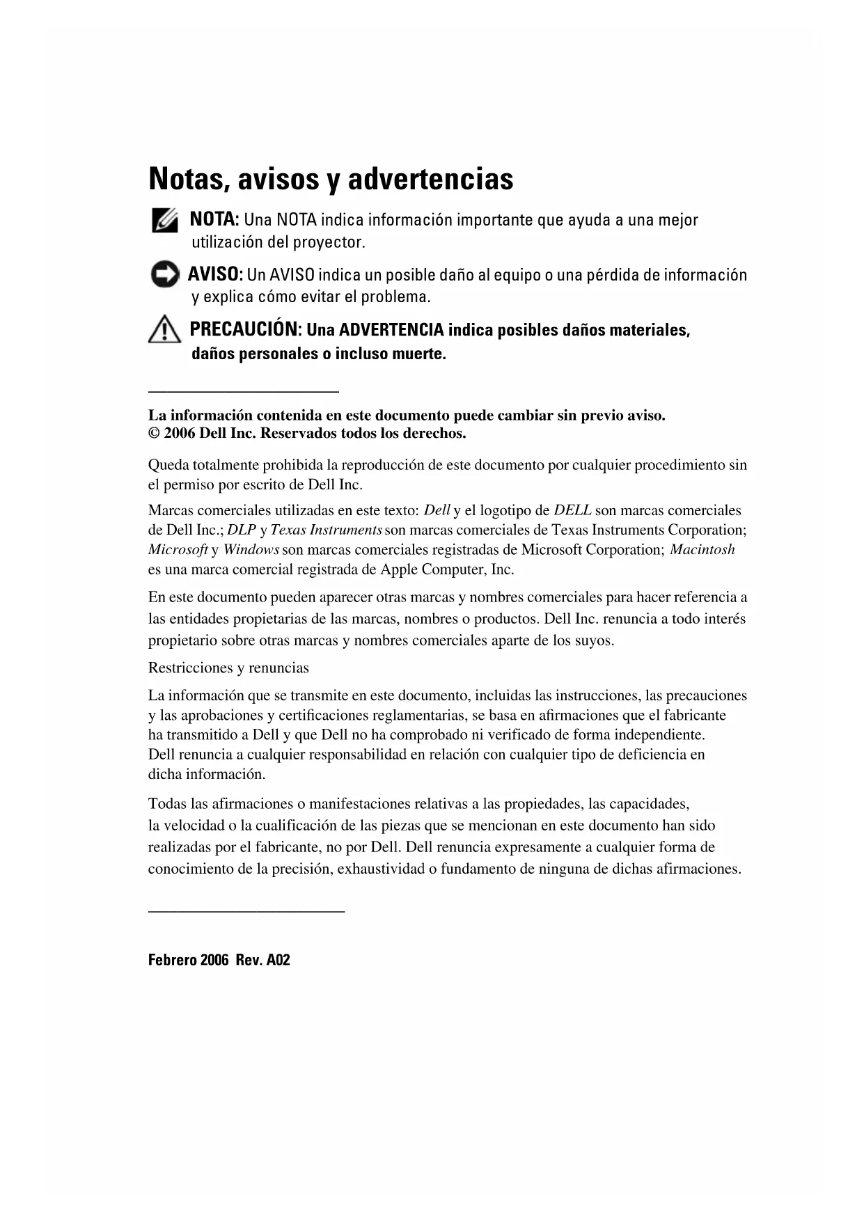 Unité principale, 142 Bague de mise au point, 142 Bouton élévateur, 142 Ergot du zoom, 142 Objectif, 142 Panneau de contrôle, 142208 Indexwww.dell.com | support.dell.com Proyector Dell™ 1100MP Manual del usuarioNotas, avisos y advertencias NOTA: Una NOTA indica información importante que ayuda a una mejor utilización del proyector. AVISO: Un AVISO indica un posible daño al equipo o una pérdida de información y explica cómo evitar el problema. PRECAUCIÓN: Una ADVERTENCIA indica posibles daños materiales, daños personales o incluso muerte.