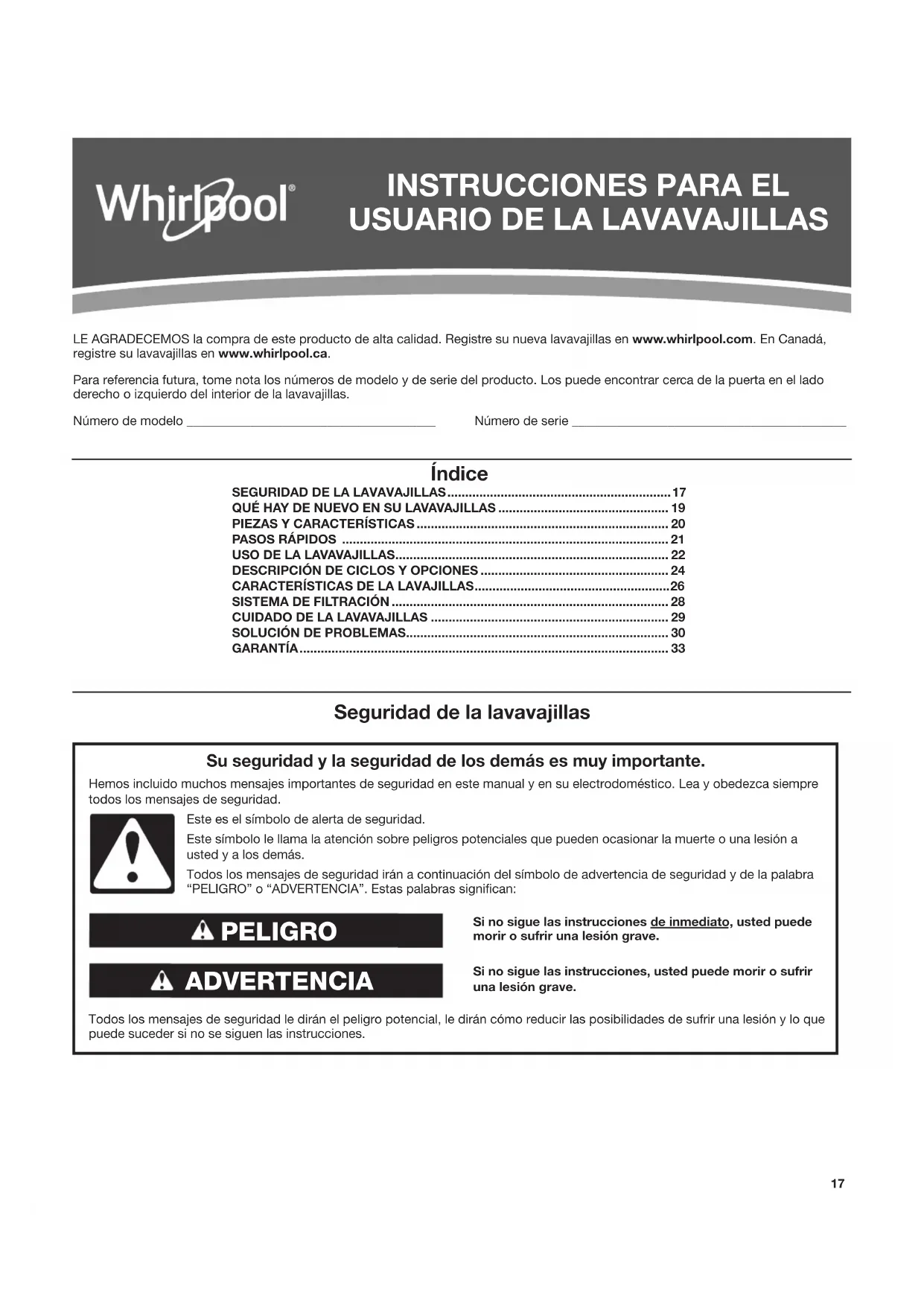 GARANTÍA ........................................................................................................ 33 LE AGRADECEMOS la compra de este producto de alta calidad. Registre su nueva lavavajillas en www.whirlpool.com. En Canadá, registre su lavavajillas en www.whirlpool.ca. Para referencia futura, tome nota los números de modelo y de serie del producto. Los puede encontrar cerca de la puerta en el lado derecho o izquierdo del interior de la lavavajillas. Número de modelo _______________________________________ Número de serie ___________________________________________ Seguridad de la lavavajillas Si no sigue las instrucciones de inmediato, usted puede morir o sufrir una lesión grave. Si no sigue las instrucciones, usted puede morir o sufrir una lesión grave. Todos los mensajes de seguridad le dirán el peligro potencial, le dirán cómo reducir las posibilidades de sufrir una lesión y lo que puede suceder si no se siguen las instrucciones. Su seguridad y la seguridad de los demás es muy importante. Hemos incluido muchos mensajes importantes de seguridad en este manual y en su electrodoméstico. Lea y obedezca siempre todos los mensajes de seguridad. ADVERTENCIA PELIGRO Este es el símbolo de alerta de seguridad. Este símbolo le llama la atención sobre peligros potenciales que pueden ocasionar la muerte o una lesión a usted y a los demás. Todos los mensajes de seguridad irán a continuación del símbolo de advertencia de seguridad y de la palabra “PELIGRO” o “ADVERTENCIA”. Estas palabras significan:18
